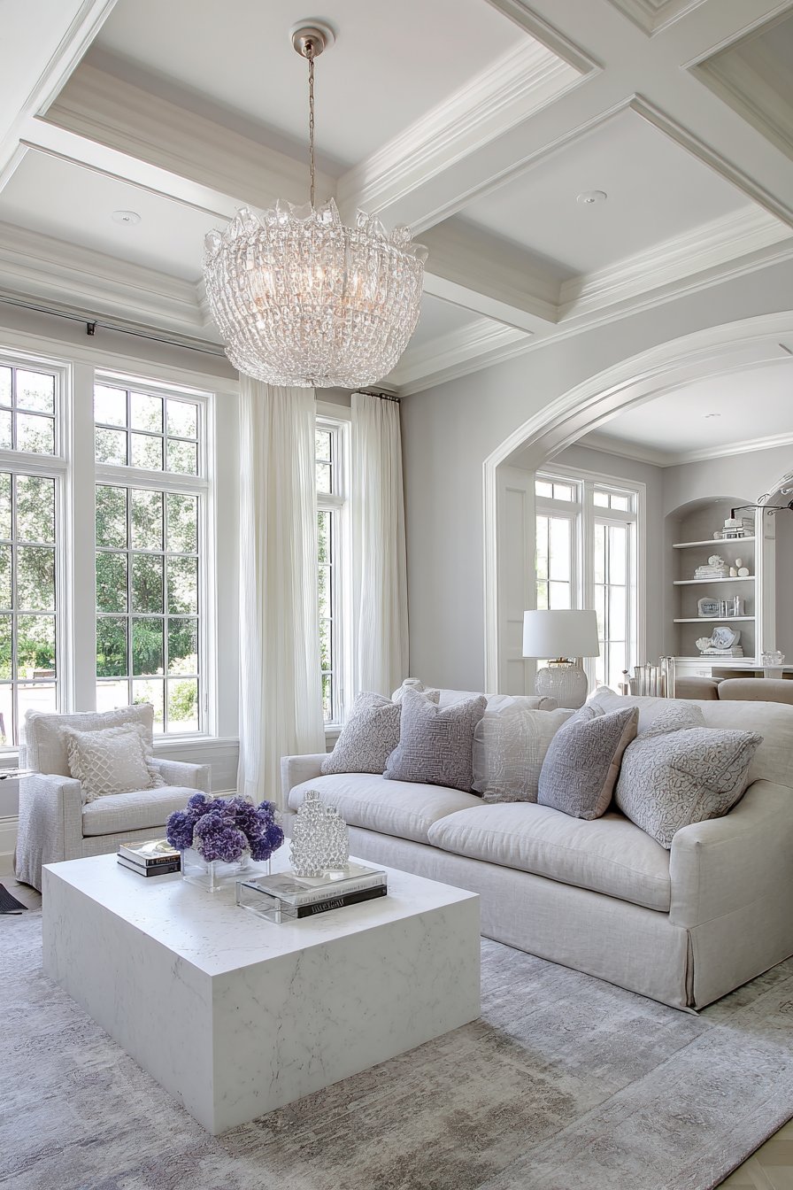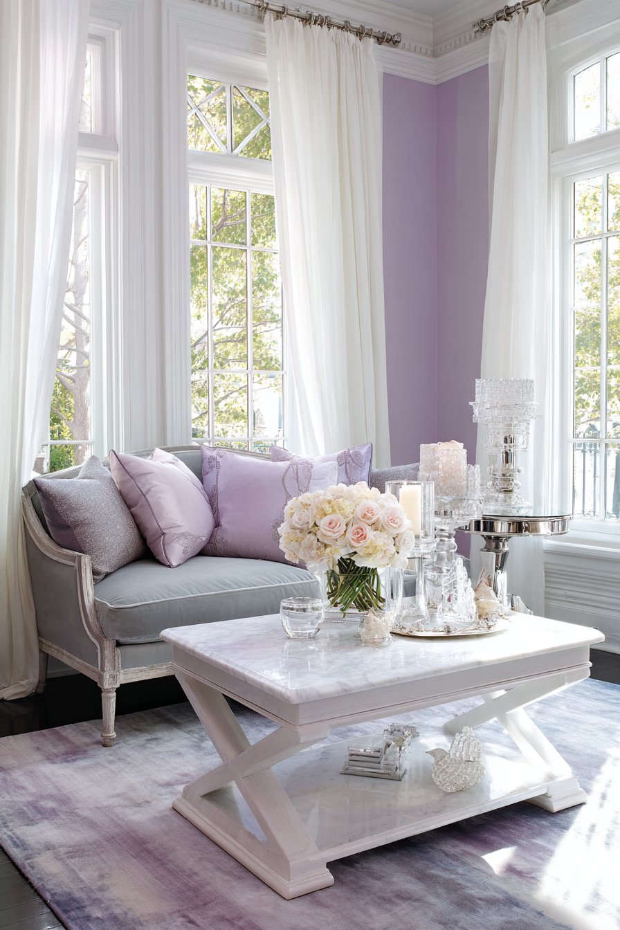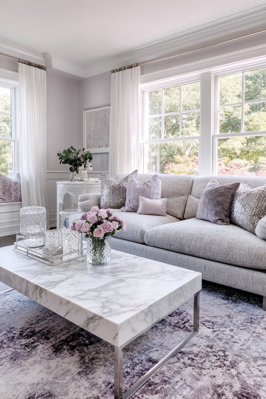 Silver and crystal accessories provide understated sparkle that catches light without disrupting the peaceful atmosphere. Sheer white curtains diffuse natural light creating an ethereal glow that enhances the dreamy quality of lavender-grey living room color ideas. The overall effect creates spaces that feel like gentle clouds—soft, peaceful, and infinitely restful.