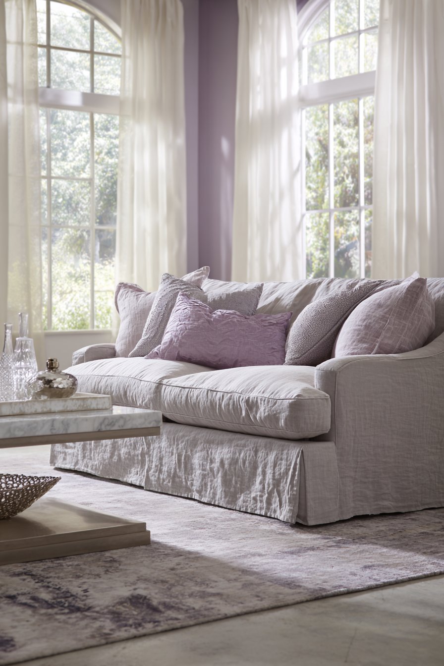 Soothing living room color ideas featuring soft lavender and grey tones create serene sanctuaries that promote relaxation and peace. This gentle palette combines the calming properties of grey with lavender’s subtle color interest for spaces that feel like visual spa retreats. Walls painted in the palest lavender-grey create a serene backdrop for a dove grey linen sofa with relaxed silhouette, establishing a foundation of gentle, harmonious tones.