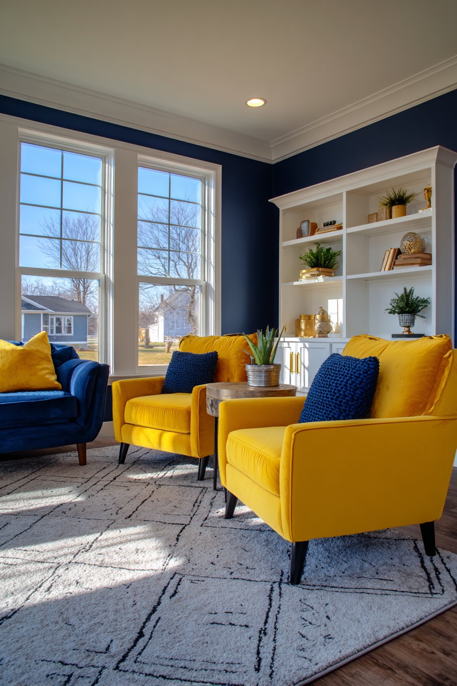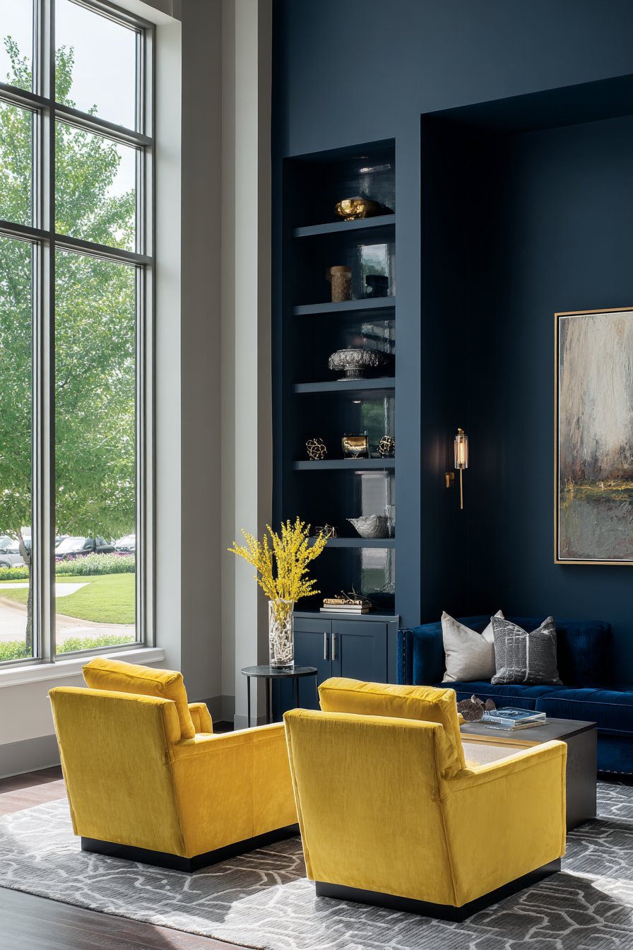 The mustard yellow velvet armchairs positioned at strategic angles inject warmth and energy into the space, their rich texture catching light beautifully and creating focal points that draw the eye. The statement navy accent wall behind built-in shelving creates architectural depth while providing the perfect backdrop for displaying curated accessories in complementary brass and yellow tones. This combination of navy and mustard represents one of the most dynamic living room color ideas for those seeking to make a bold statement without sacrificing sophistication.