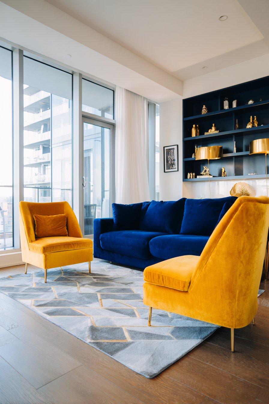The light grey area rug with geometric patterns grounds the seating arrangement while providing a neutral bridge between the bold color choices, preventing visual overwhelm. Natural light flooding through large windows plays a crucial role in this color scheme, as it highlights the interaction between the deep, rich navy and the bright, saturated yellow. Throughout the day, as light shifts and changes, the relationship between these colors evolves, creating different moods and atmospheres within the same space.