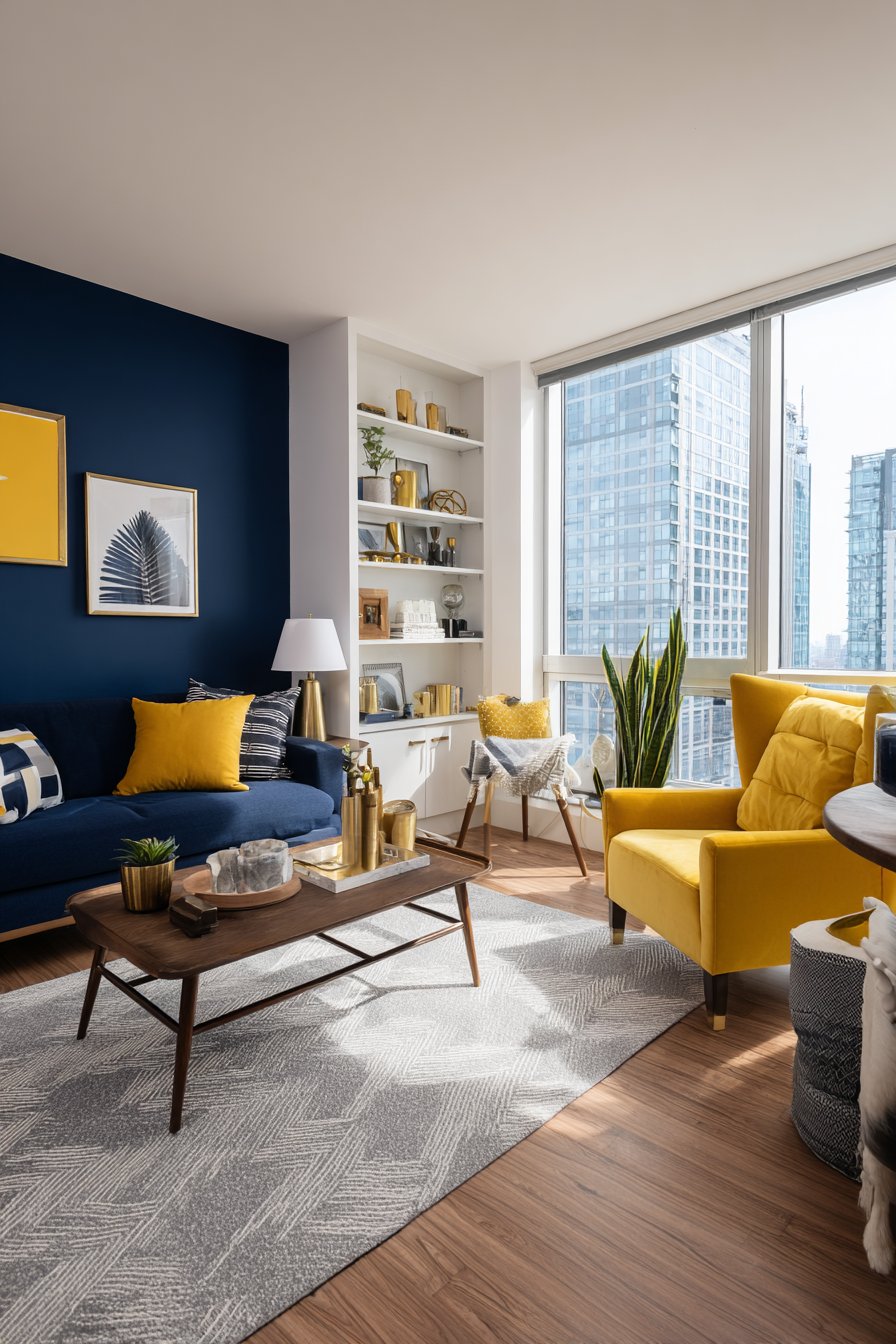 To successfully execute this living room color idea, maintain a roughly 60-30-10 color distribution—use navy as your dominant color, mustard yellow as your secondary accent, and white or neutral tones as your foundation. Introduce metallic accents in brass or gold to complement the warm yellow tones while adding a layer of sophistication and light reflection. Balance the boldness of these saturated colors by keeping walls neutral, which prevents the space from feeling overwhelming or claustrophobic. Consider the room’s natural light when selecting your specific shades—rooms with abundant natural light can handle deeper, more saturated versions of these colors, while spaces with limited light benefit from slightly lighter variations. Use patterns strategically, perhaps in throw pillows or artwork, that incorporate both colors to create visual cohesion throughout the space.