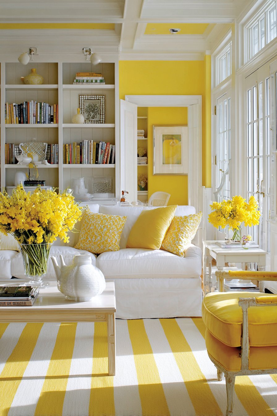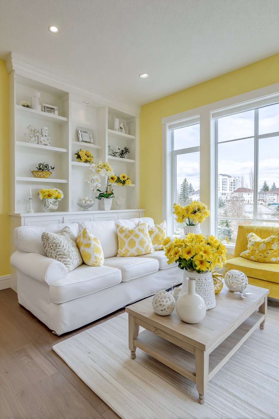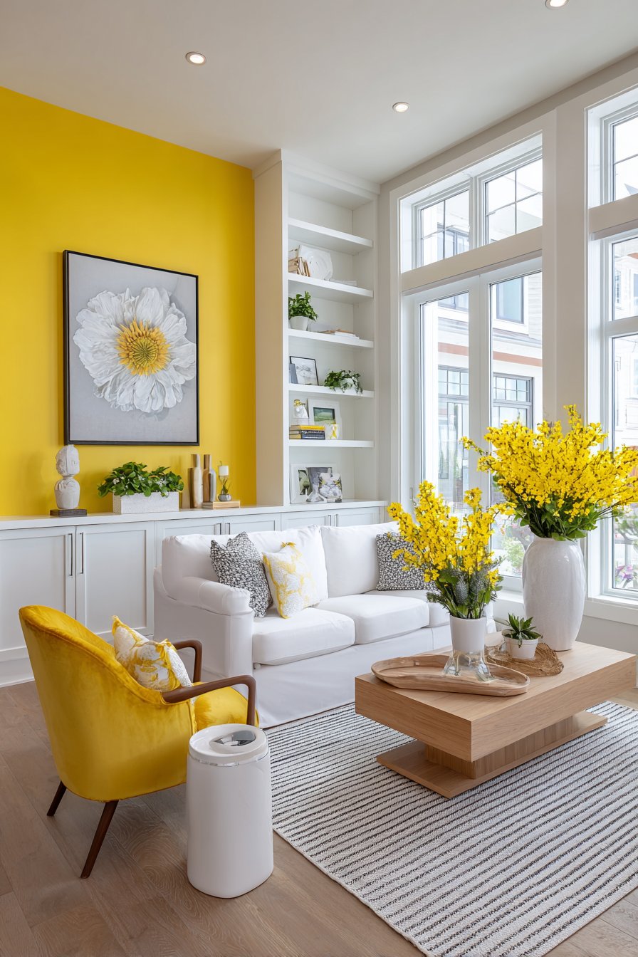 White ceramic accessories and yellow fresh flowers in clear vases accessorize the space with freshness and natural beauty. Large windows maximize natural light which amplifies the bright living room color ideas, as yellow works best in naturally bright spaces where its cheerful qualities can fully shine. The overall effect creates spaces that feel like permanent sunshine—uplifting, warm, and endlessly optimistic.