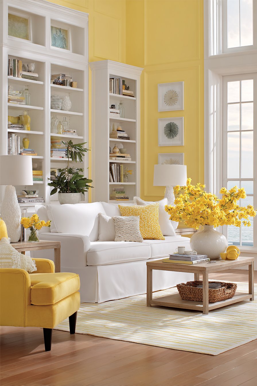 Cheerful living room color ideas featuring sunny yellow and crisp white create uplifting spaces that radiate positivity and energy. This optimistic palette taps into yellow’s psychological properties as a mood-elevating color while maintaining sophistication through careful application. A white slipcovered sofa provides clean foundation against walls painted in soft butter yellow, establishing the bright, cheerful tone while maintaining livability through the neutral sofa.