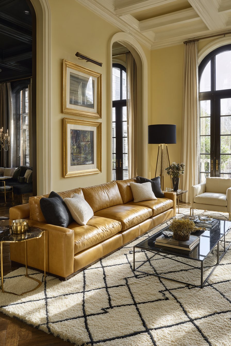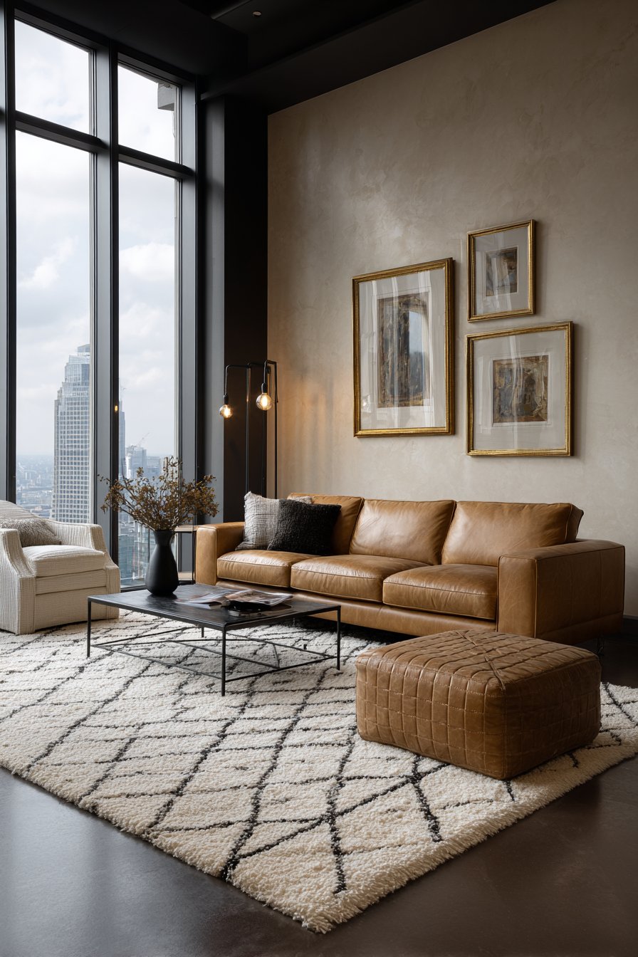 Camel leather ottoman and cream linen armchair provide additional seating while reinforcing the warm neutral foundation. Black and brass floor lamp and black window frames add graphic contrast that gives this palette contemporary sophistication. Natural light through tall windows highlights the rich living room color ideas, as natural light brings out the warmth and depth in camel leather while emphasizing the dramatic black accents.