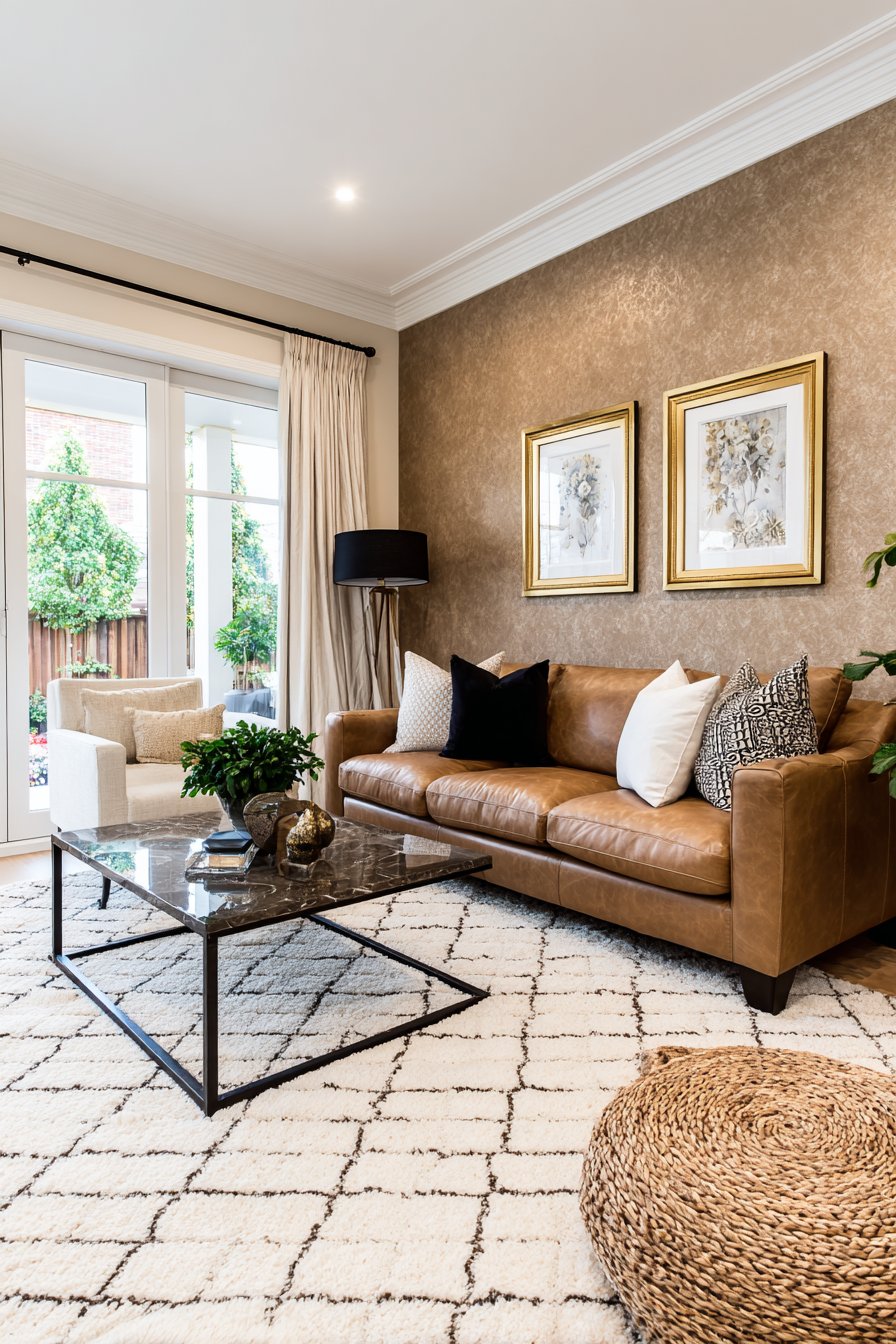 Sophisticated living room color ideas featuring camel and cream with black accents create spaces of refined elegance and timeless appeal. This palette combines warm neutral tones with graphic black contrast for contemporary sophistication. A luxurious camel-colored leather sofa with modern silhouette anchors the space against warm cream walls, the rich leather providing both substantial presence and sophisticated warmth.