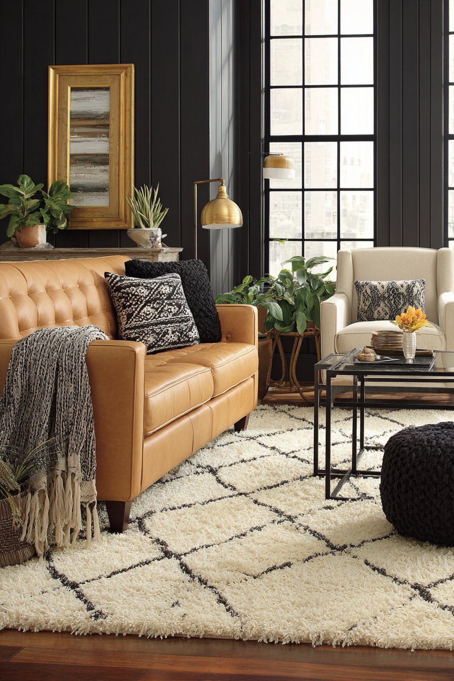 Black accent wall with subtle texture creates dramatic backdrop for gold-framed artwork, demonstrating how black can serve as a powerful supporting player in living room color ideas dominated by warm neutrals. Cream area rug with geometric black pattern grounds the seating area while introducing graphic interest. Black metal and glass coffee table adds contemporary edge that prevents the warm palette from feeling too traditional or safe.