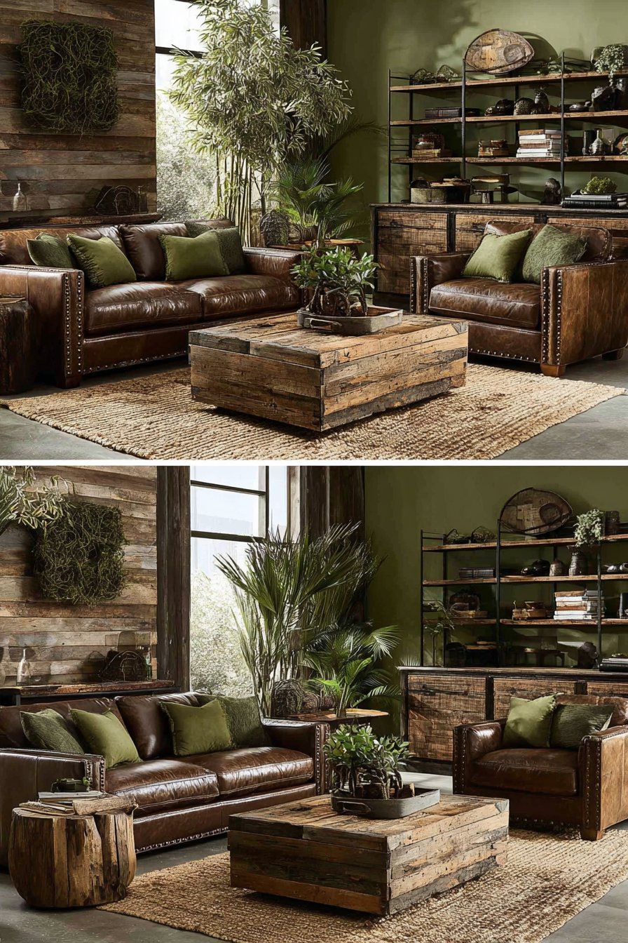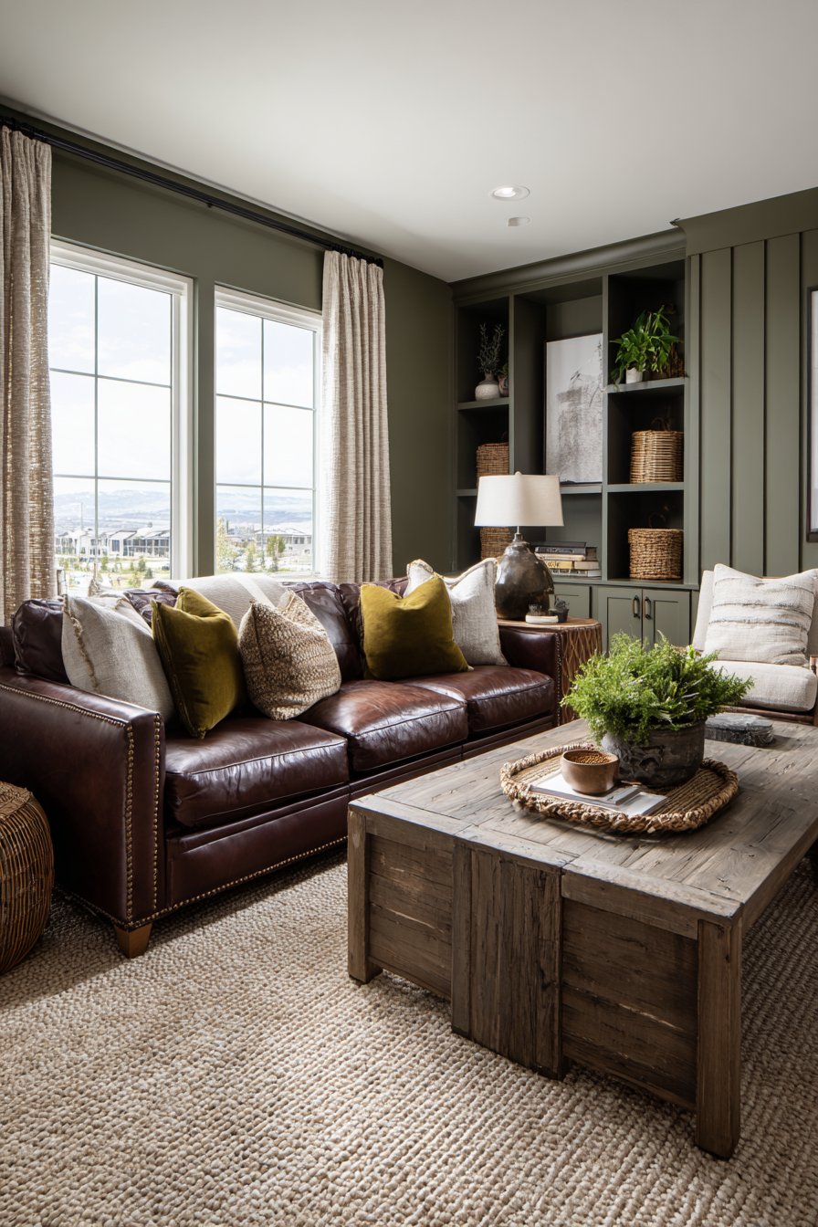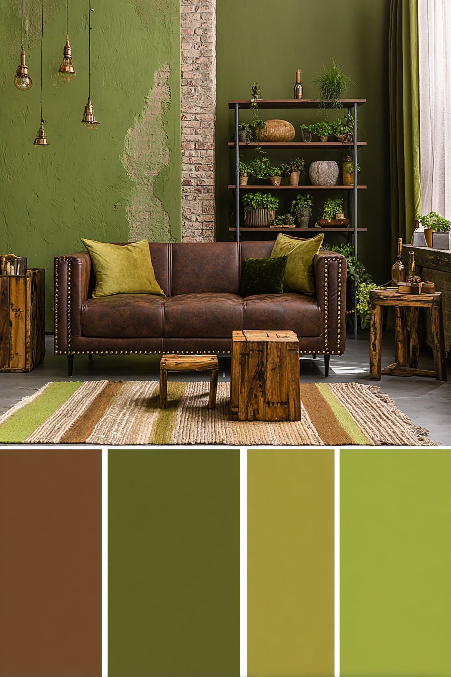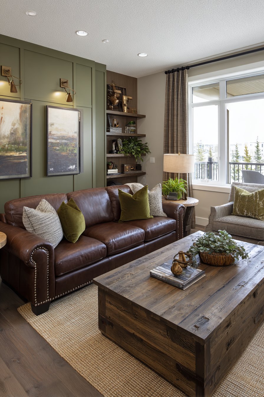 Nature-connected living room color ideas featuring moss green and warm brown tones create grounding spaces that celebrate organic materials and earth colors. This palette draws directly from forest floors and natural landscapes for inherently calming, connected environments. Textured walls in soft moss green create an organic backdrop for a chocolate brown leather sofa with nailhead trim, establishing the earth-toned foundation through complementary natural colors.