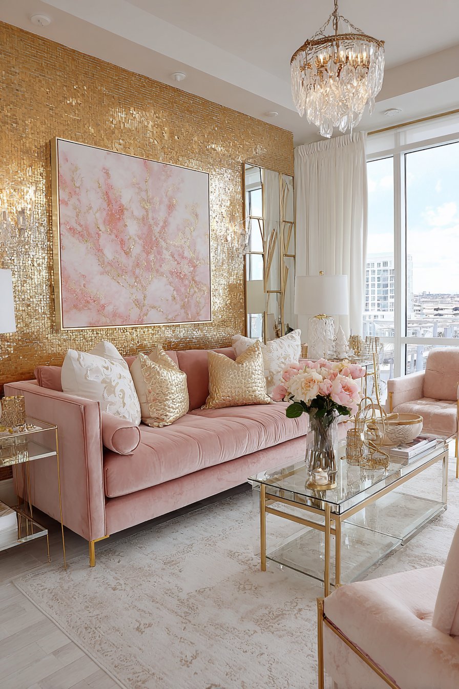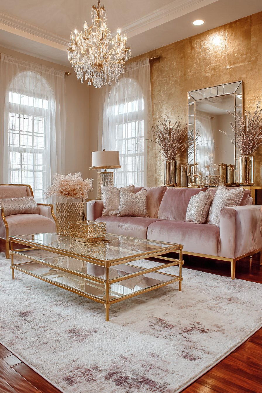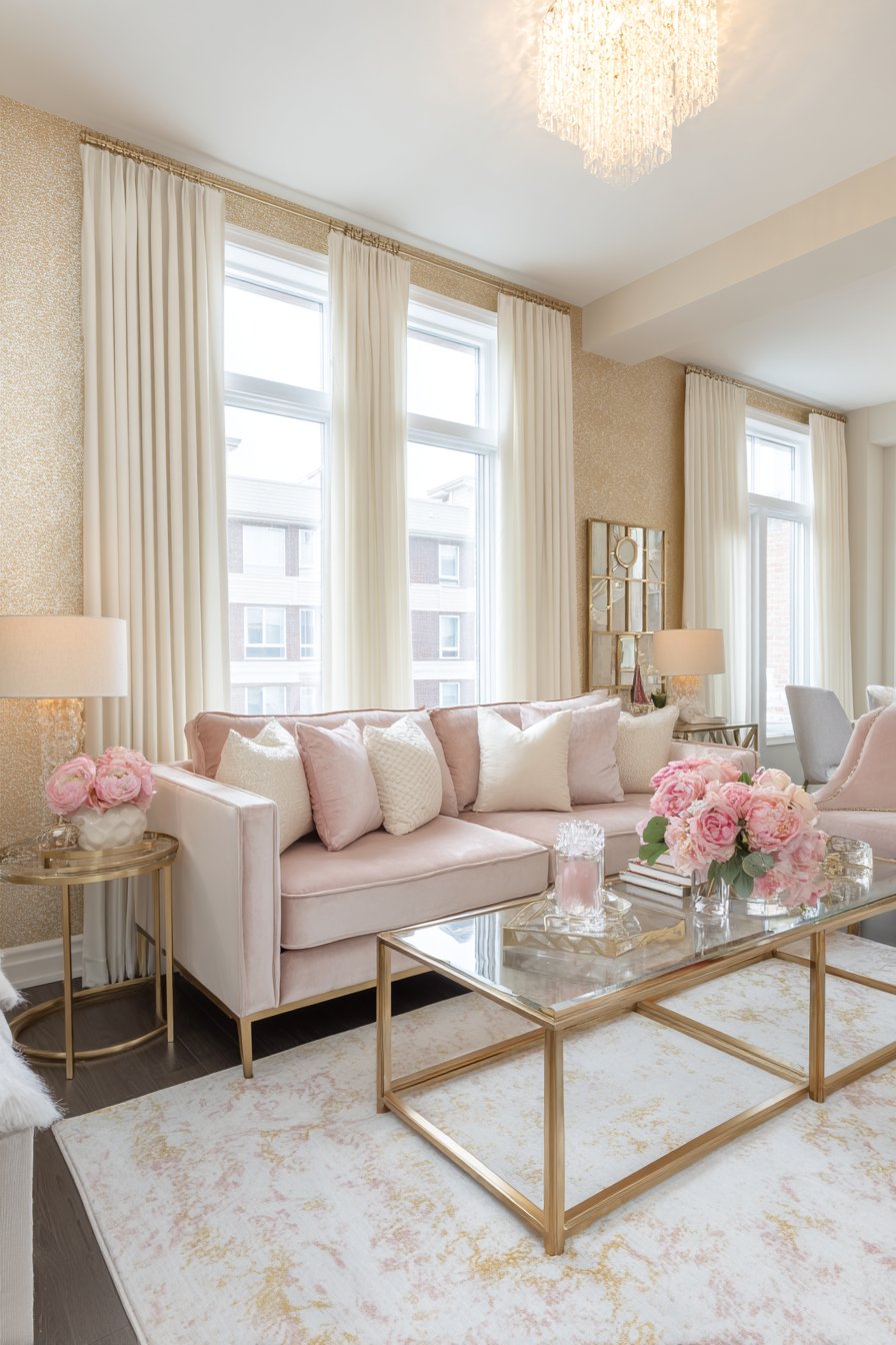 Opulent living room color ideas featuring champagne gold and blush with ivory create spaces of sophisticated glamour and feminine elegance. This luxurious palette combines metallic shimmer with soft color for rooms that feel like jewelry boxes. Walls painted in soft ivory provide an elegant canvas for a blush pink velvet sofa with gold legs, the combination of soft color and metallic detail immediately establishing the glamorous aesthetic.
