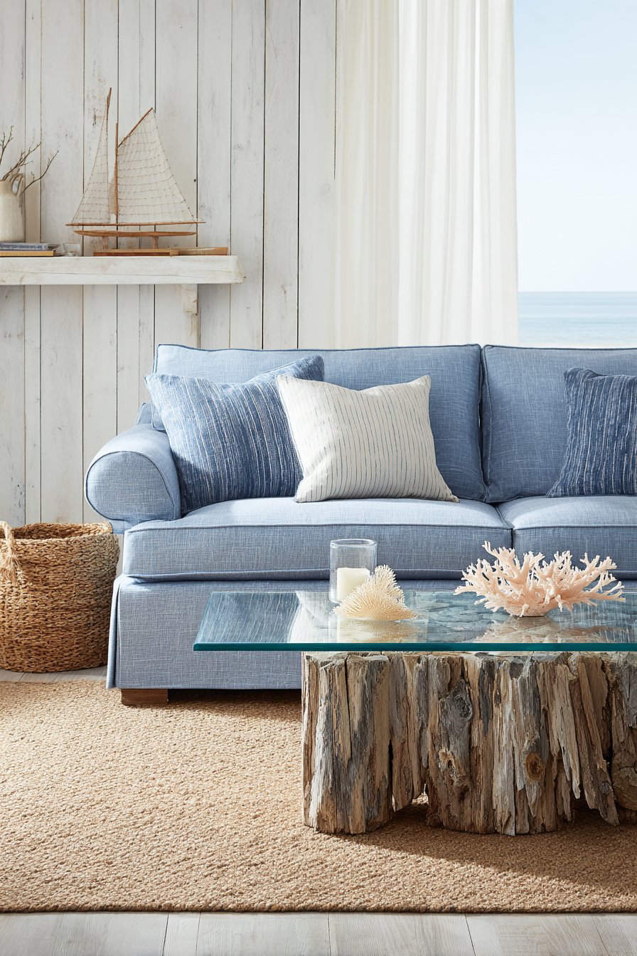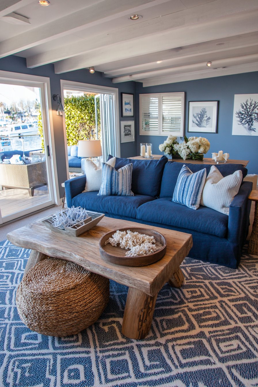 To successfully create coastal living room color ideas with driftwood grey and ocean blue, choose weathered, warm greys that evoke actual driftwood rather than cool, modern greys that feel more urban than coastal. Layer multiple shades of blue from deep navy to pale sky to create oceanic depth and prevent monotony within the blue family. Incorporate natural, weathered materials—whitewashed wood, rope, jute, linen—that authentically represent coastal environments and craftsmanship. Keep the overall palette light and bright to maintain the airy, open feeling essential to coastal design—dark or saturated coastal colors should be used sparingly as accents. Maximize natural light and create visual connections to outdoor spaces where possible, as coastal design celebrates the relationship between interior and exterior environments.