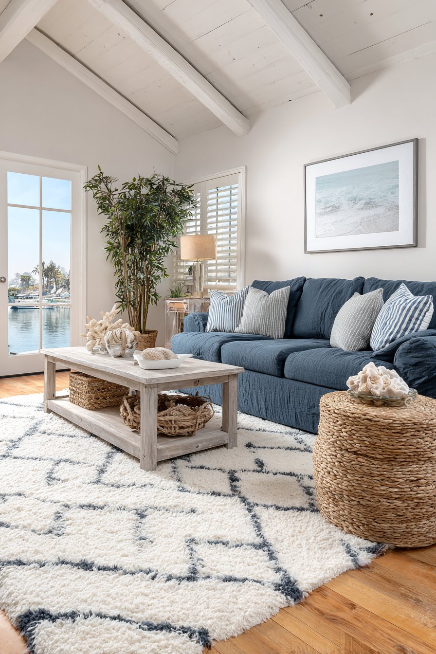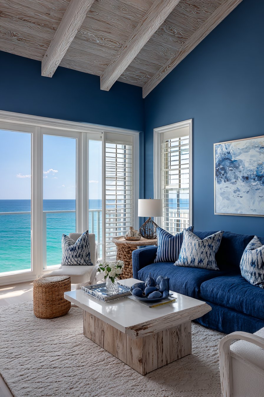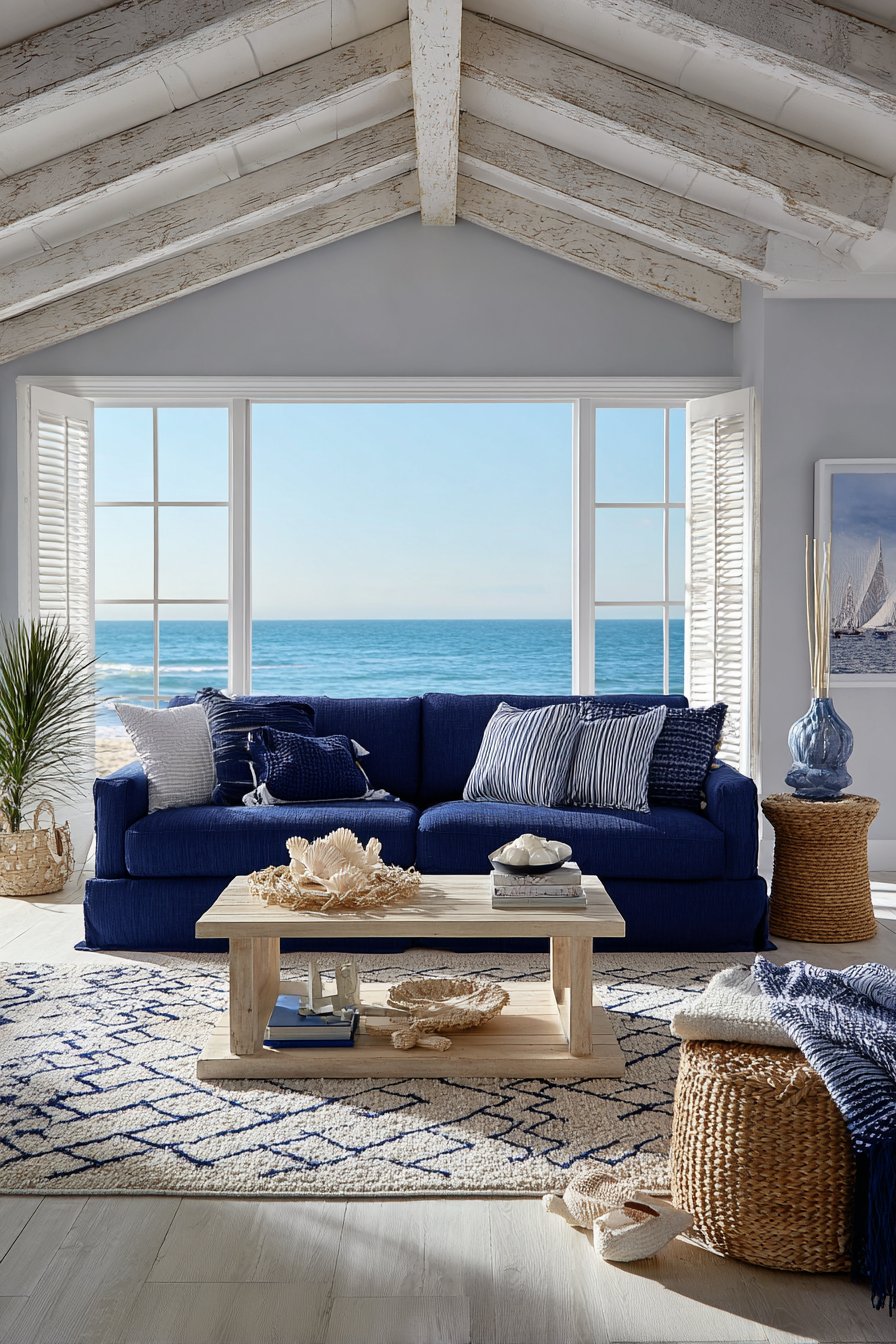 Blue and white striped throw pillows and sea glass accessories reinforce the nautical living room color ideas without resorting to literal beach clichés like anchors or shells. White painted wood ceiling beams add architectural interest that enhances the coastal cottage feeling. Large windows with white shutters maximize ocean views and natural light essential to coastal living room color ideas that celebrate connection to beach environments.