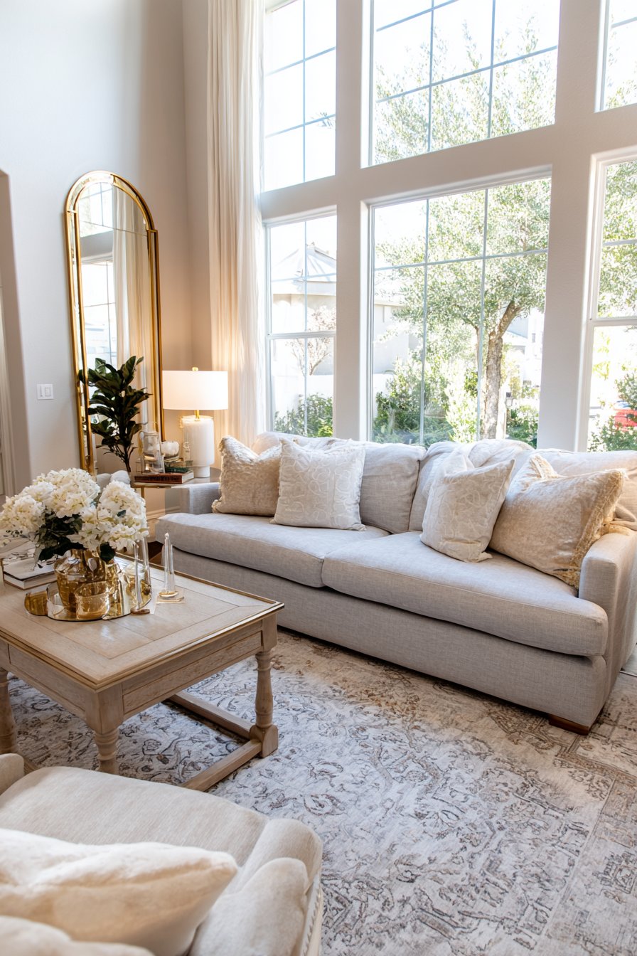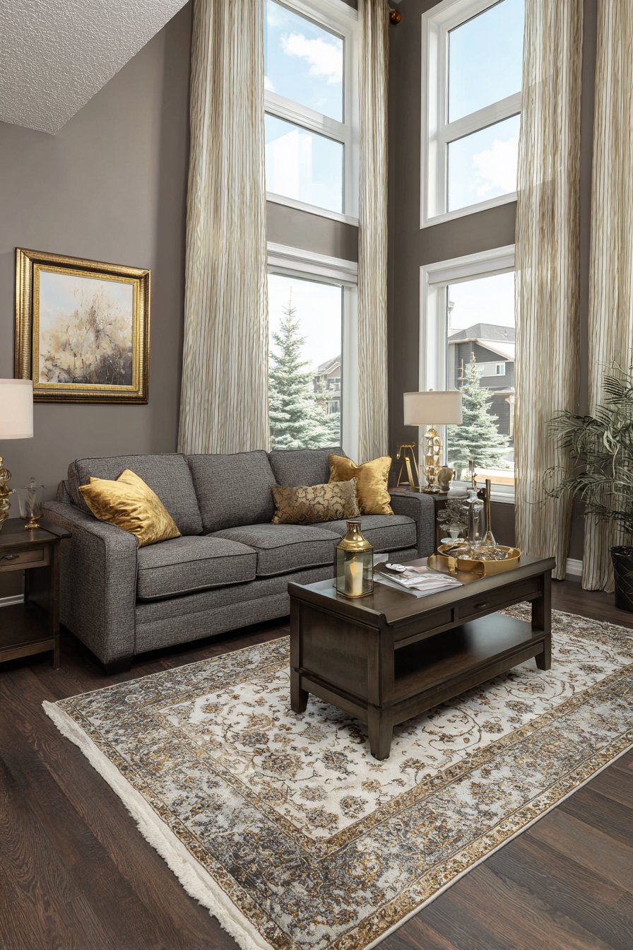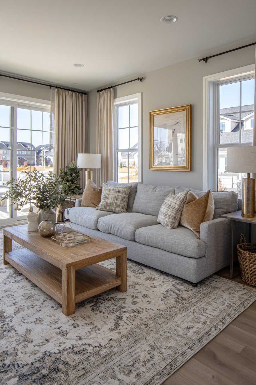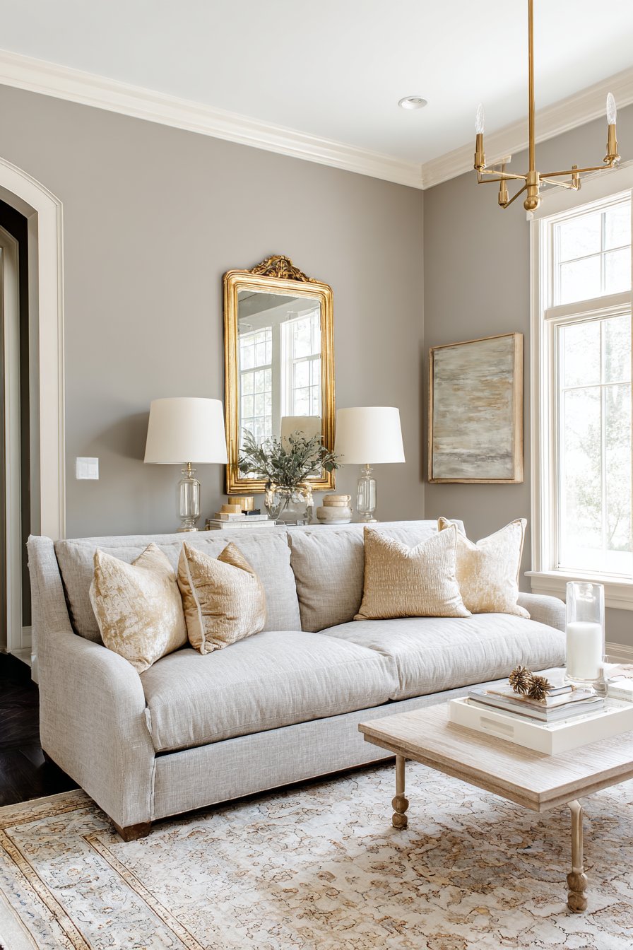 Soft gold velvet throw pillows and brushed gold table lamps provide refined metallic touches that warm beautifully against greige’s balanced neutral tone. Gold-framed mirror above the sofa reflects natural light while adding another layer of subtle metallic accent. Cream linen curtains with subtle sheen frame large windows, allowing natural light that brings out greige’s complex undertones—this color appears quite different under various lighting conditions and truly comes alive with abundant natural light.