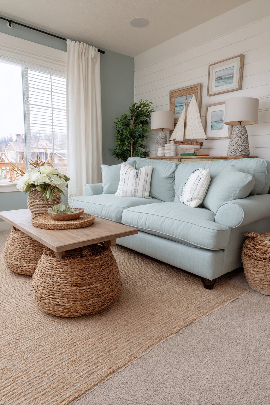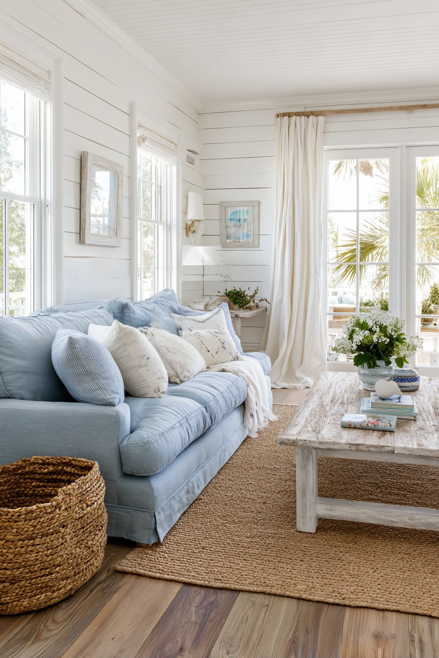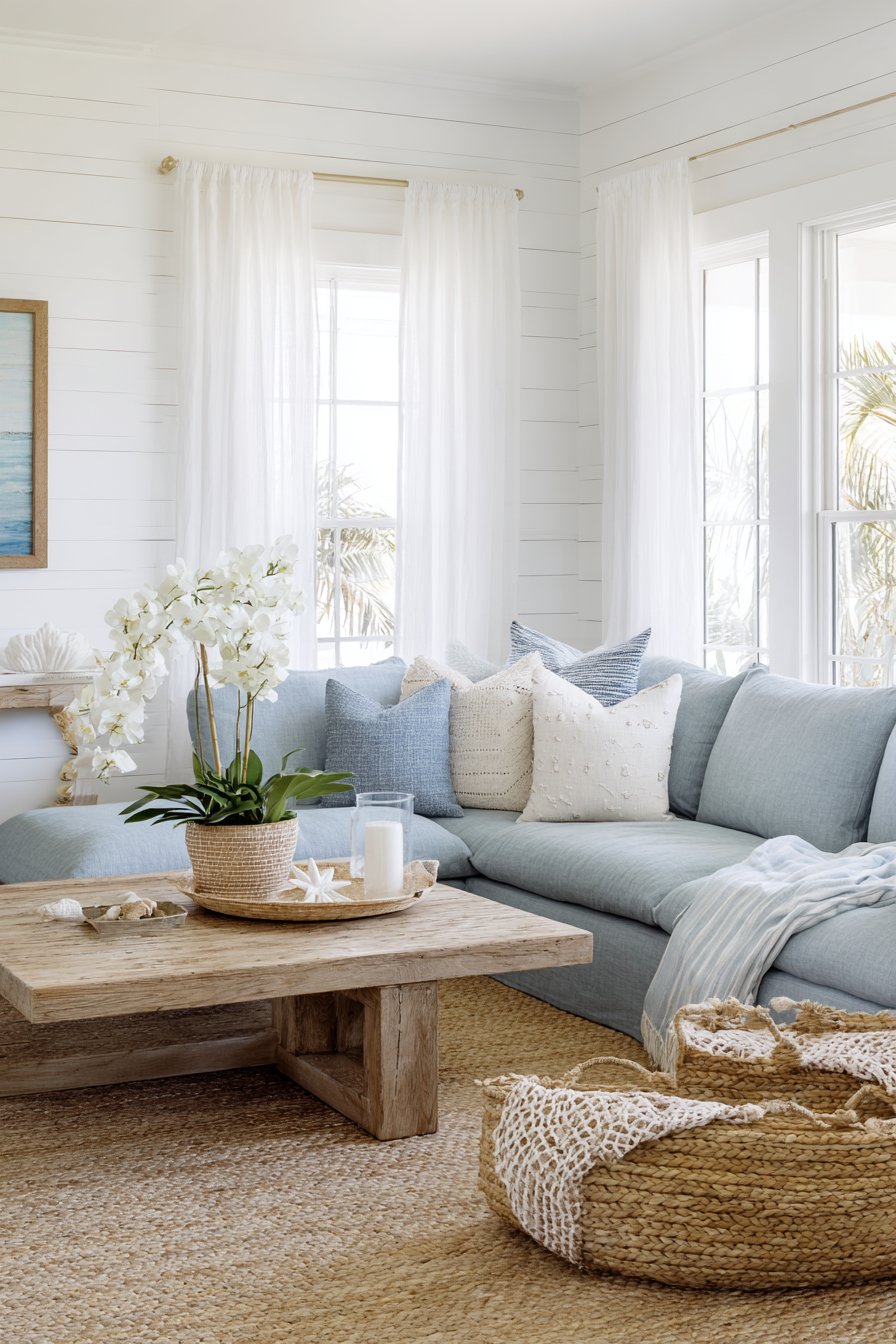 Coral and white decorative pillows reference beach elements with sophistication, avoiding cliché while still celebrating the coastal inspiration. The sisal area rug in natural tan grounds the space while contributing additional organic texture that echoes sand and natural fibers. Sheer white curtains filter sunlight beautifully, creating the bright, sun-washed atmosphere characteristic of beachside homes where indoor and outdoor living blend seamlessly.