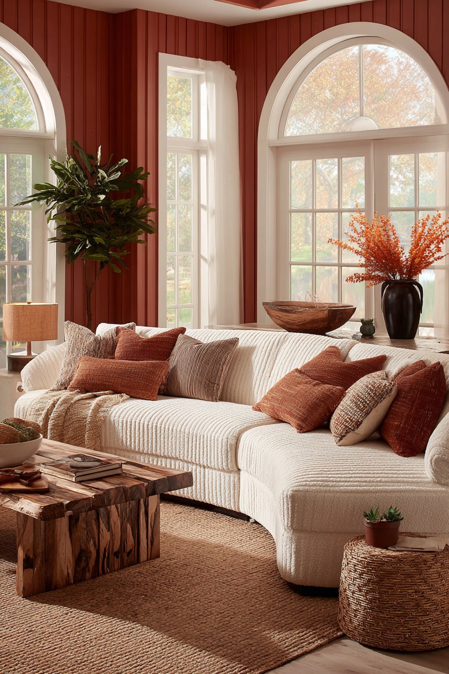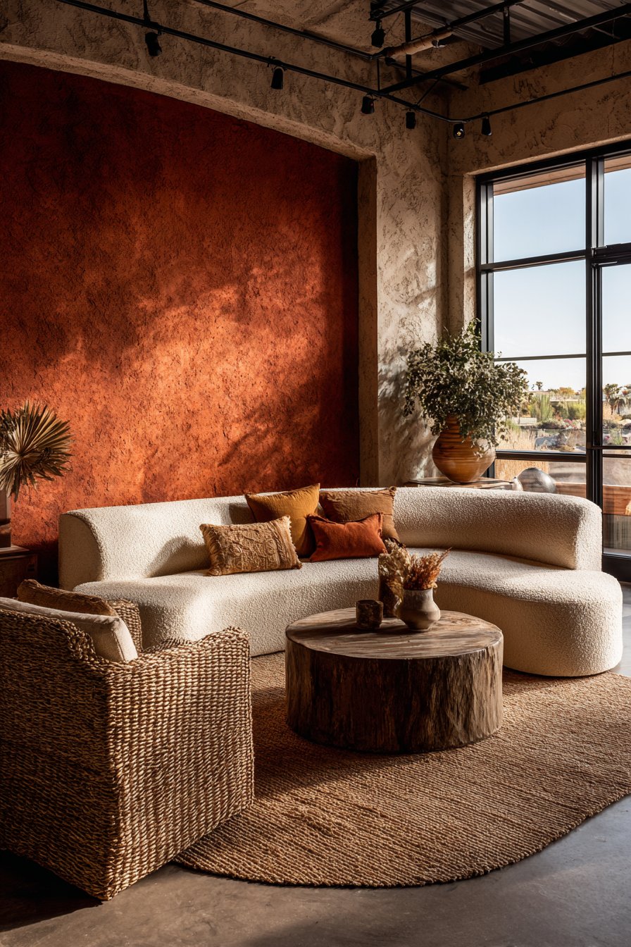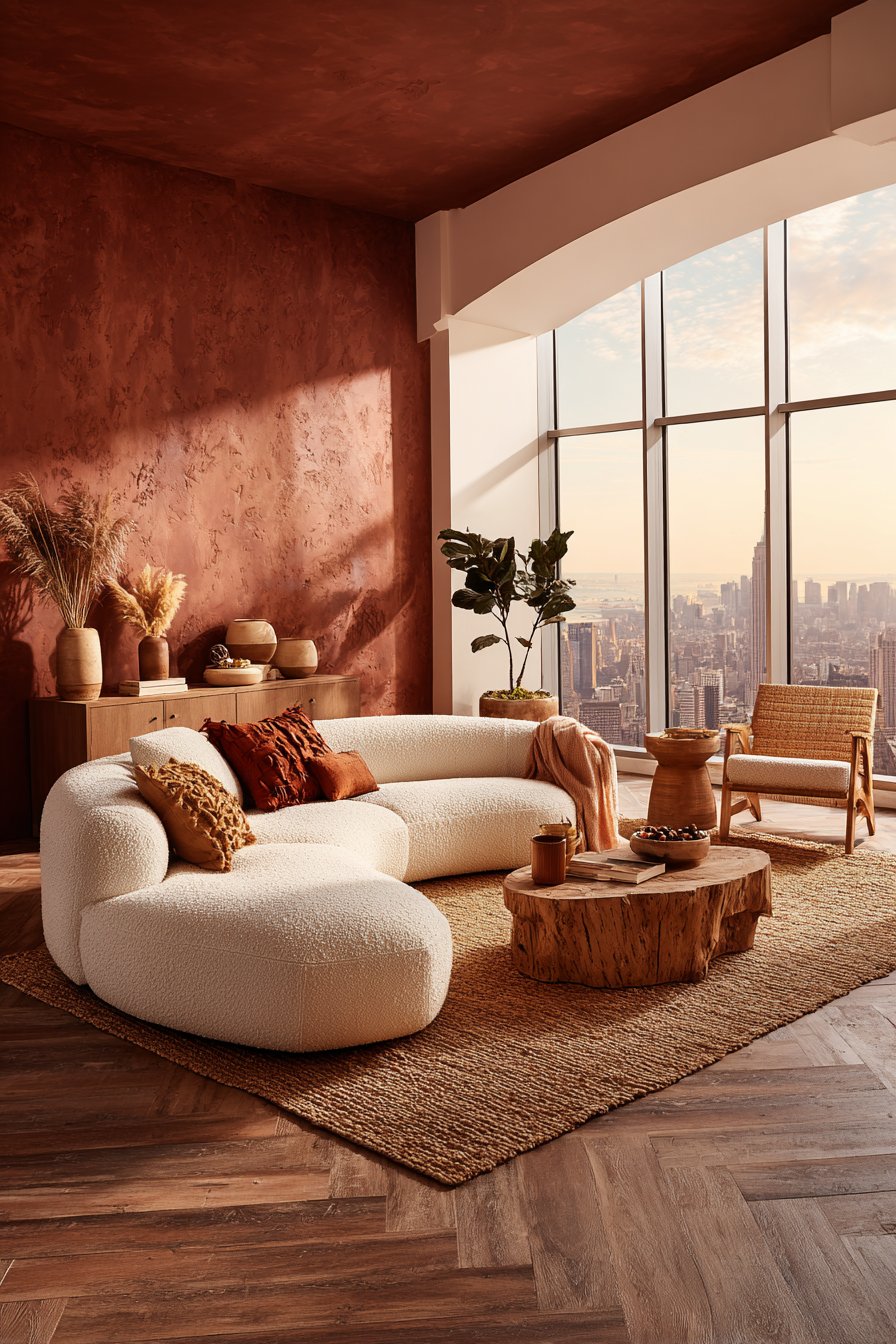 Earth-toned living room color ideas featuring terracotta and cream create spaces that feel inherently warm and welcoming, tapping into our innate connection to natural clay colors and organic materials. The rich terracotta painted accent wall serves as a stunning focal point, its subtle texture adding depth while the warm orange-red tones create an immediately inviting atmosphere. Against this bold backdrop, a curved sectional in rich cream bouclé fabric provides luxurious seating that balances the terracotta’s intensity with soft, neutral sophistication.