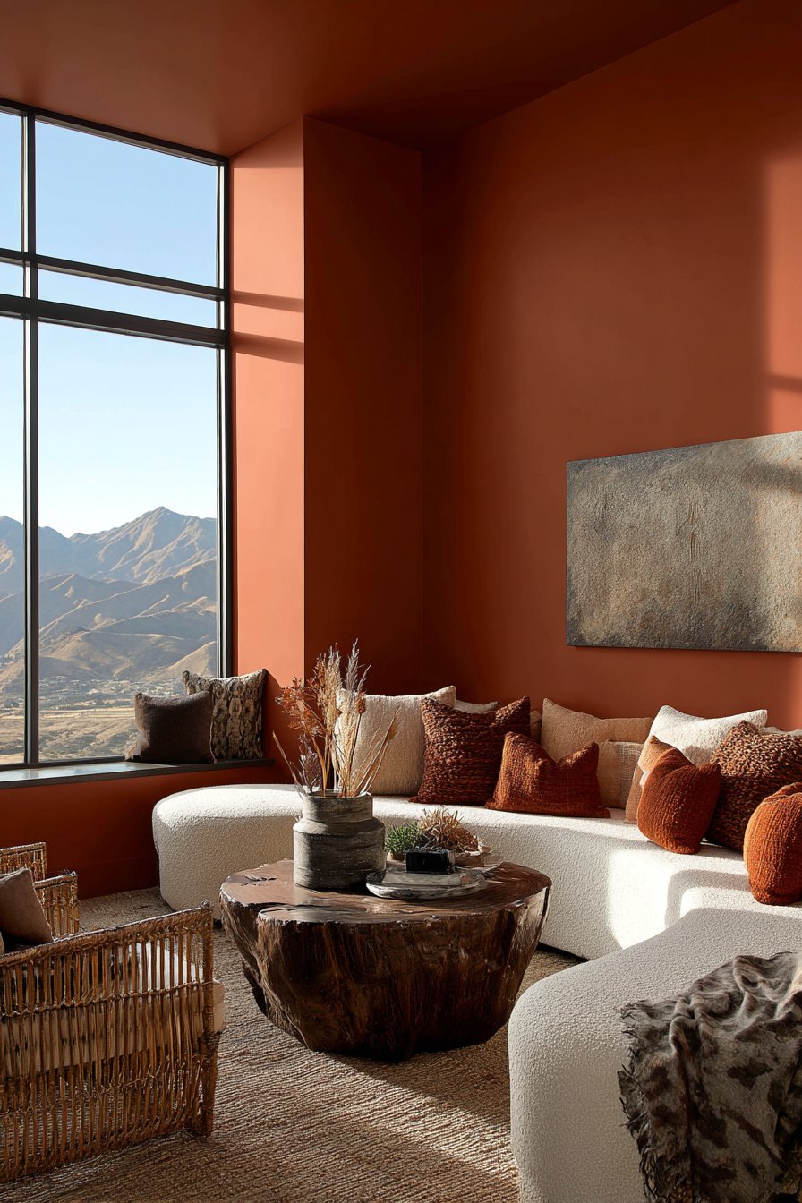 The remaining walls in warm off-white create breathing room and prevent the space from feeling too saturated, demonstrating the importance of balance in living room color ideas that incorporate strong earth tones. Natural rattan accent chairs and a live-edge wood coffee table introduce organic elements that feel perfectly at home within this warm palette, their natural materials echoing the earthiness of terracotta. These wooden elements add varied brown tones that create additional depth within the overall warm color scheme.