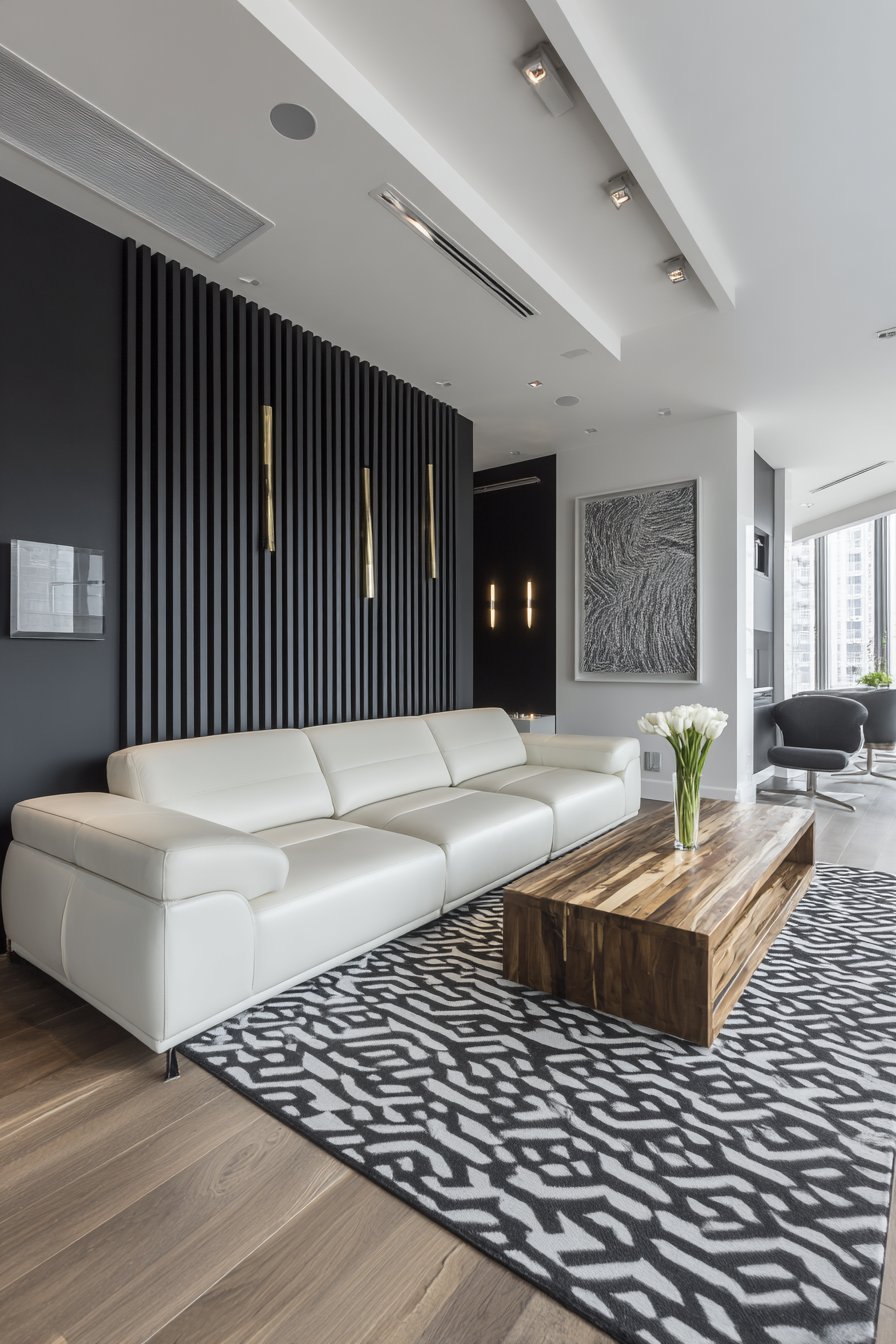 Modern living room color ideas that embrace stark black and white create spaces of graphic sophistication and timeless appeal. This high-contrast approach proves that you don’t need a rainbow of colors to create visual drama—sometimes the most powerful statements come from the simplest palettes. The low-profile white leather sofa provides clean, contemporary seating that contrasts beautifully against a matte black accent wall featuring vertical paneling that adds architectural interest and textural depth.