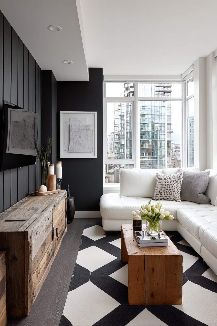 Black and white abstract art reinforces the color scheme while adding artistic sophistication, transforming the walls into gallery-like spaces. The introduction of natural wood through a reclaimed wood media console and coffee table proves essential in preventing this black and white living room color idea from feeling too stark or cold. These warm wood tones bridge the extreme contrast and add organic warmth that makes the space feel livable rather than purely aesthetic.