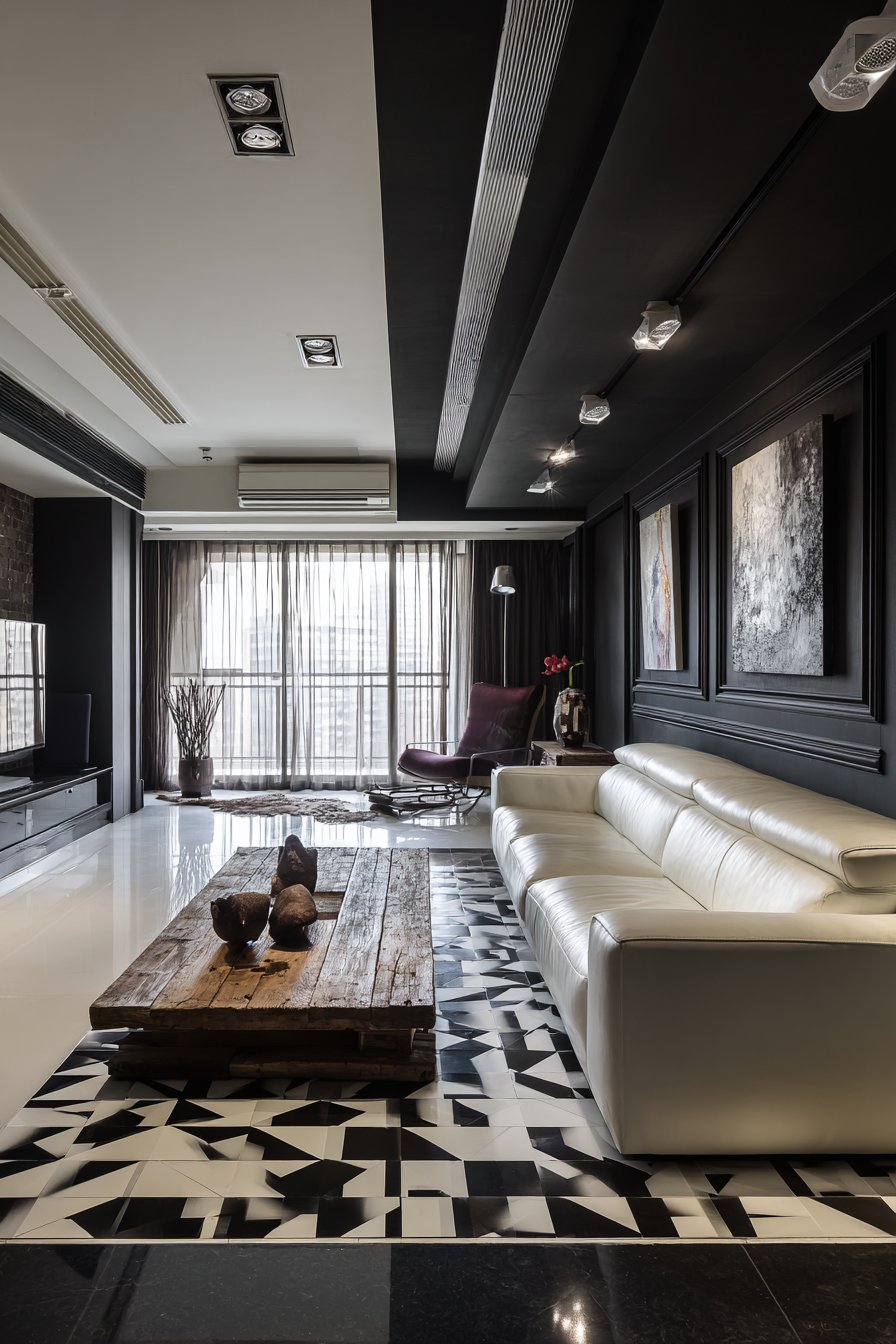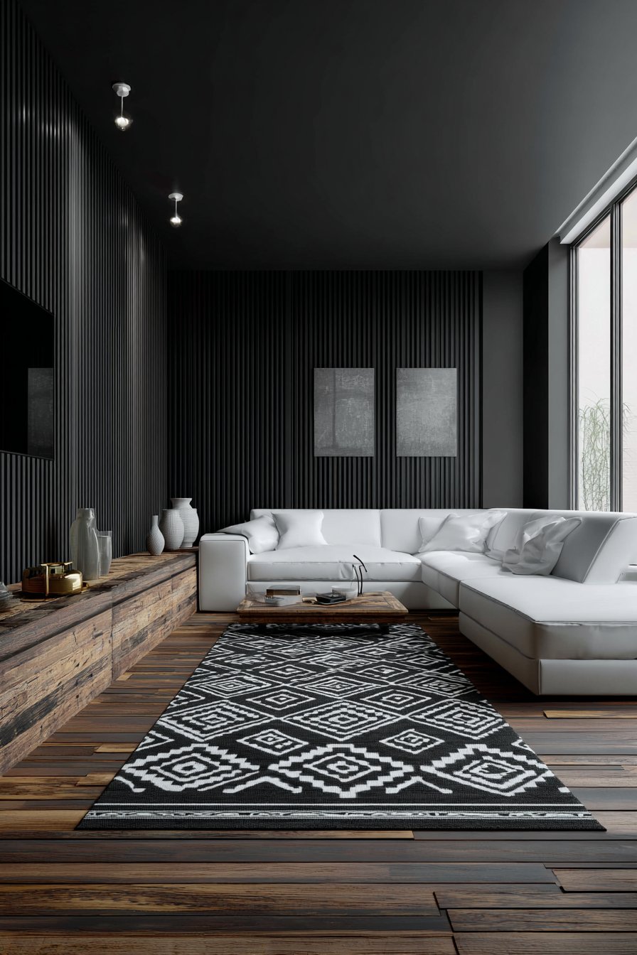 The black and white geometric area rug defines the seating zone while introducing pattern that energizes the space without disrupting the strict color discipline. Chrome and brass mixed metal accents add subtle shine and contemporary edge, demonstrating how metallic finishes can enhance black and white living room color ideas. The combination of recessed lighting and large windows ensures balanced illumination crucial for spaces working with such high contrast—insufficient lighting can make black walls feel oppressive rather than sophisticated.
