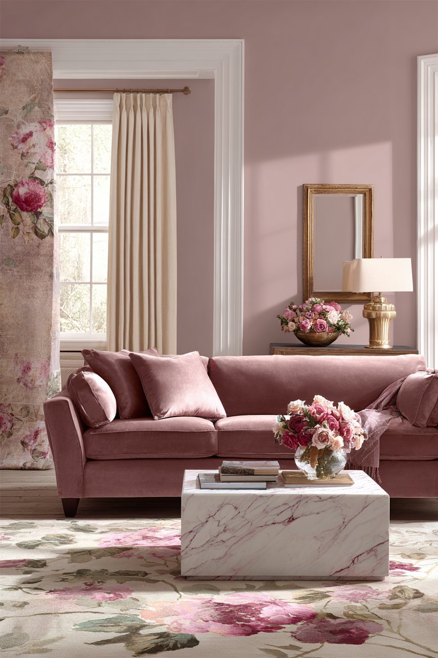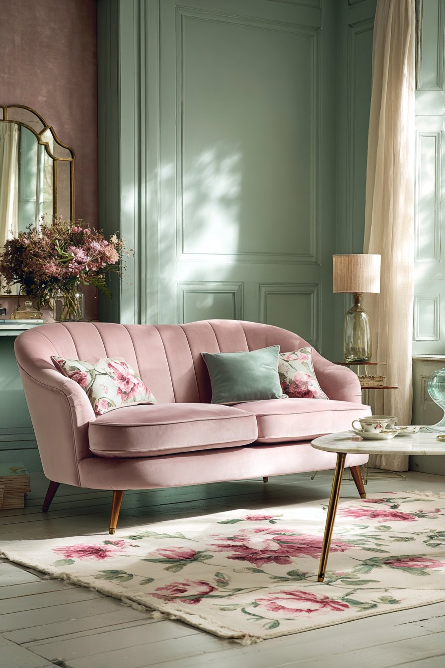 Feminine yet sophisticated living room color ideas that combine blush pink and sage green create spaces that feel both contemporary and romantically timeless. This unexpected color pairing has gained popularity for its ability to create soft, welcoming environments without feeling overly sweet or juvenile. The dusty rose pink velvet sofa anchors the space with luxurious texture and substantial presence against walls painted in the softest sage green, a color known for its calming properties and versatility.