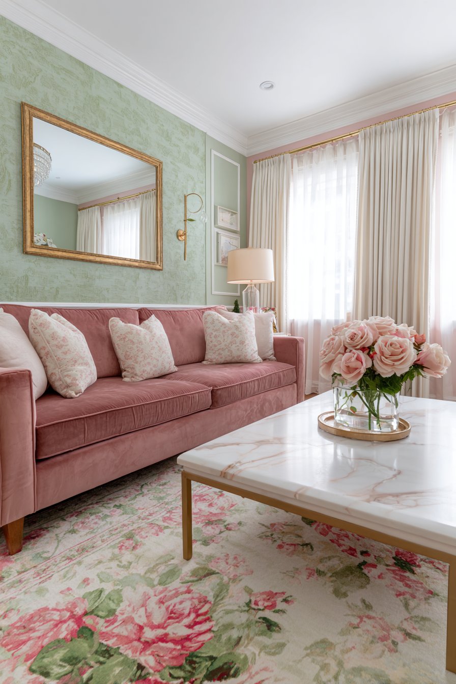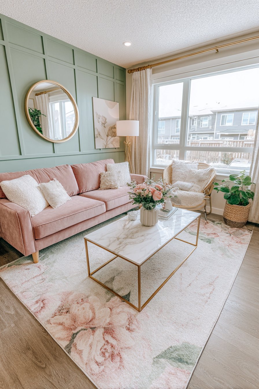 The blush pink accent wall behind the sofa features subtle grasscloth wallpaper texture, adding tactile dimension while intensifying the pink tones in a sophisticated way. Gold-framed mirror and brass table lamp introduce metallic warmth that complements both the pink and green tones beautifully, demonstrating how metallic accents can unify living room color ideas built around complementary pastels. The cream area rug with pink and green floral motifs ties the palette together while grounding the space with neutral foundation.