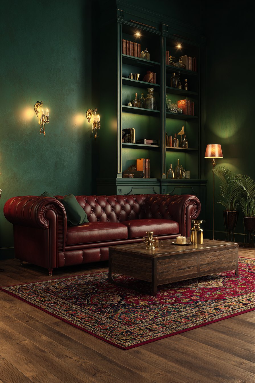Natural oak flooring and a rustic wood coffee table provide essential warmth and prevent the deep green from feeling too oppressive. These natural wood elements in lighter finishes create visual relief and grounding within this dramatic color scheme. Strategically placed warm ambient lighting from table lamps and wall sconces becomes crucial in spaces using dark living room color ideas—proper lighting creates atmosphere rather than gloom, highlighting the depth and sophistication of the forest green rather than making the space feel like a cave.
