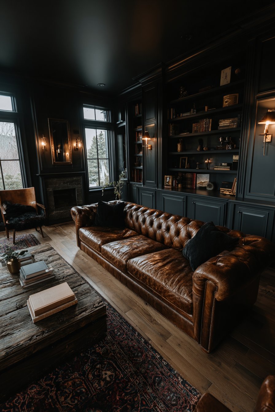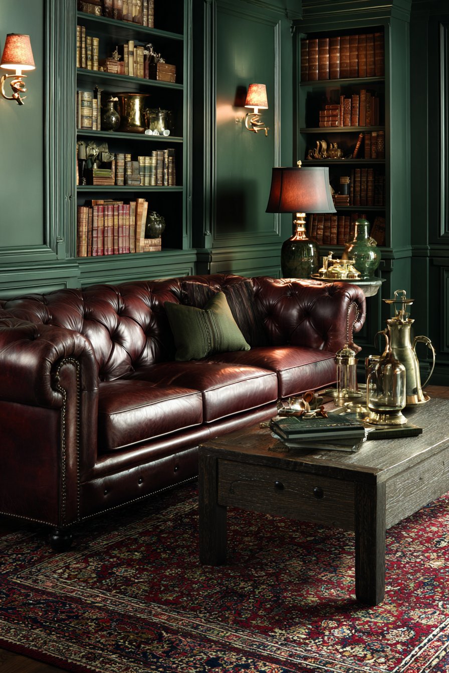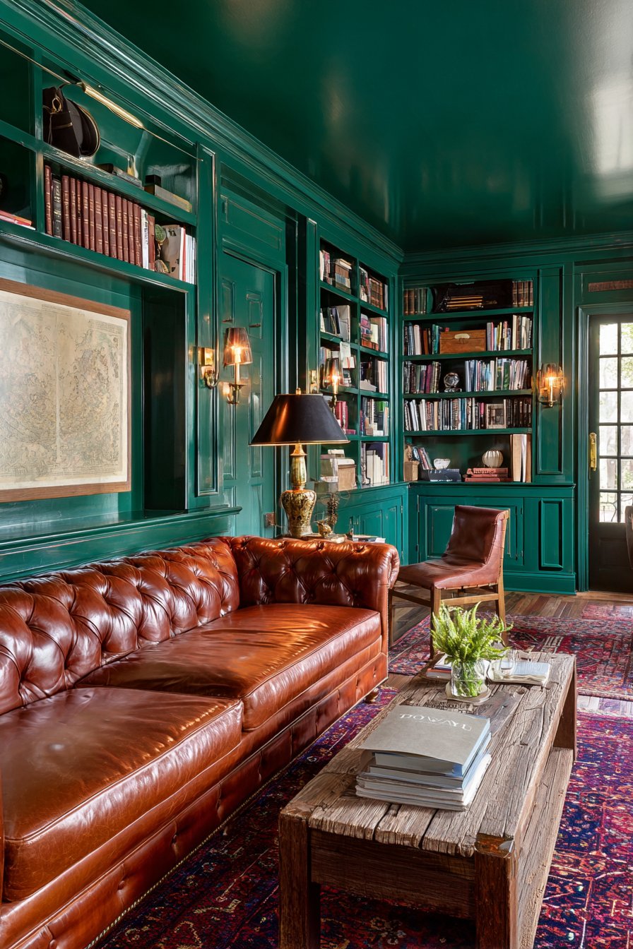 Deep, saturated living room color ideas featuring forest green walls create moody, sophisticated spaces that envelope you in rich color. This bold approach challenges the conventional wisdom that living rooms must be light and bright, instead embracing the intimacy and drama that dark colors can provide. The cognac leather Chesterfield sofa offers rich contrast against the forest green backdrop, its warm brown tones and traditional silhouette creating a classic pairing that feels both masculine and refined.