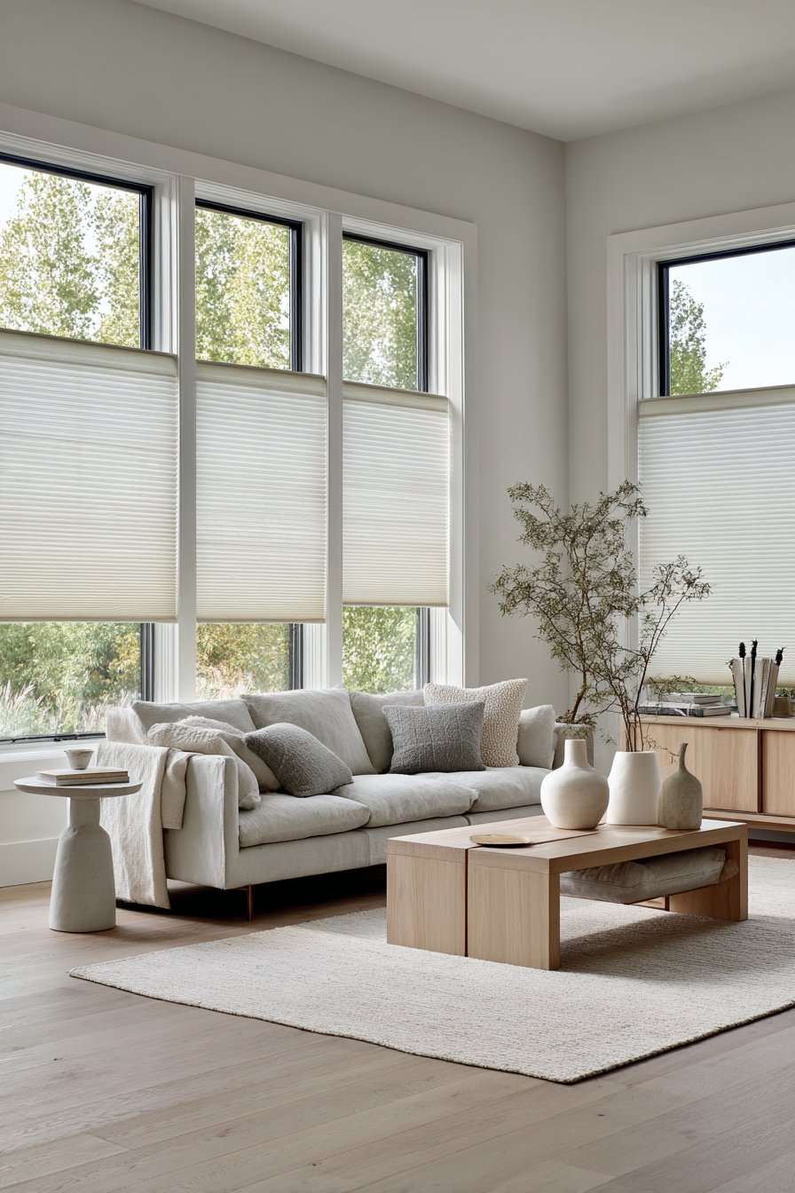 White ceramic vases and accessories maintain the clean aesthetic while adding sculptural interest through form rather than color. Large windows with minimal white Roman shades maximize natural light, which plays a crucial role in Scandinavian living room color ideas—the design philosophy developed in regions with limited daylight emphasizes maximizing and celebrating available natural light. The overall effect creates spaces that feel serene, uncluttered, and infinitely calming.