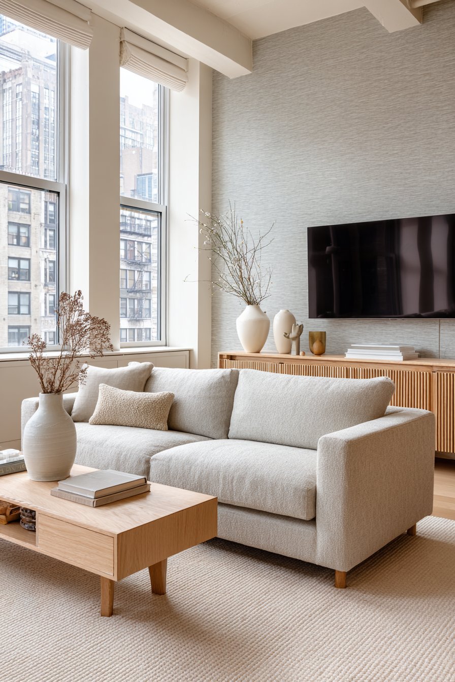 One accent wall in slightly deeper cool grey adds subtle dimension without creating harsh contrast, demonstrating the sophisticated approach to variation within Scandinavian living room color ideas. The blonde oak coffee table and media console bring organic warmth essential to preventing Nordic minimalism from feeling cold or sterile. These natural wood elements in light finishes connect the space to nature while maintaining the overall light, airy aesthetic.