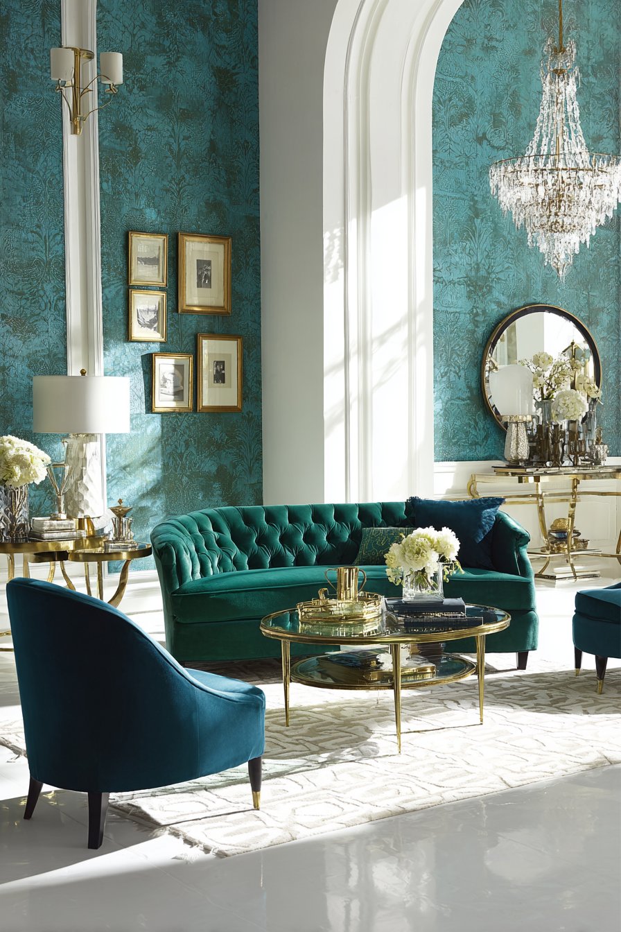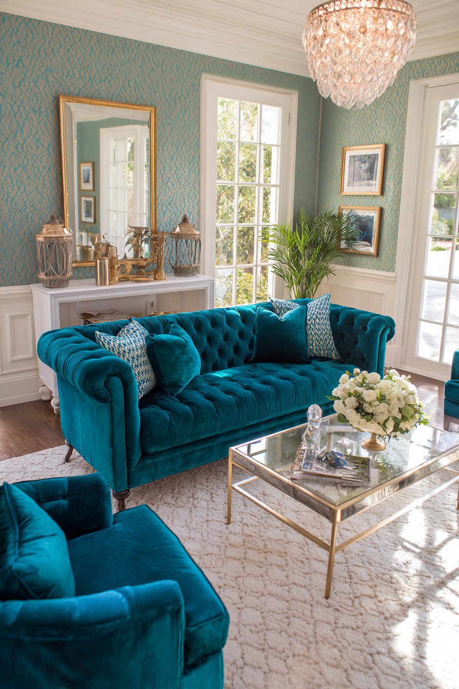 Two sapphire blue velvet accent chairs flank a brass and glass coffee table, creating a sophisticated color combination that demonstrates the power of pairing multiple jewel tones within living room color ideas. The emerald wallpaper with subtle damask pattern on one accent wall adds luxurious depth without overwhelming, its tone-on-tone pattern creating sophisticated texture. Gold picture frames, mirror, and light fixtures add glamorous touches that complement jewel tones beautifully, as warm metallics enhance the richness of these saturated colors.