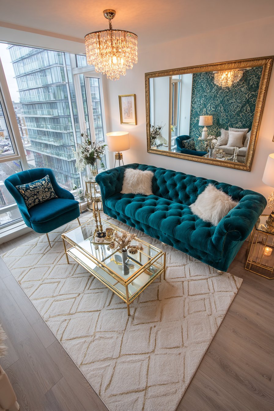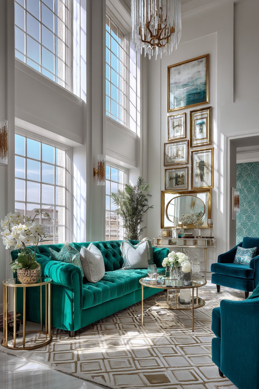 Luxurious living room color ideas featuring rich jewel tones of emerald green and deep sapphire blue create spaces of unabashed glamour and sophistication. This bold approach to color embraces the drama and intensity of saturated hues, creating living rooms that feel like jewel boxes. The emerald green velvet sofa with tufted back detail serves as the undisputed statement piece against crisp white walls, its rich texture and saturated color commanding attention while providing sumptuous seating.