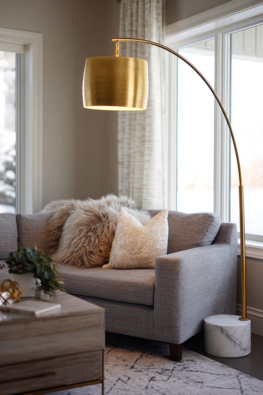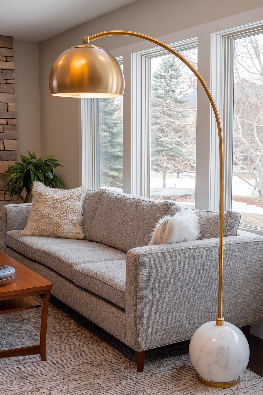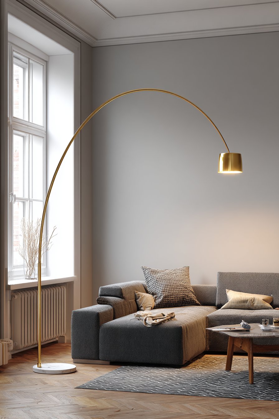 Lighting quality matters as much as aesthetic appeal in this design. The warm LED bulb creates a inviting glow that layers beautifully with natural light from nearby windows, allowing for seamless transitions from day to night. The wide-angle interior design photography perspective captures how the lamp’s elegant curve and functional placement work together, with balanced exposure highlighting the interplay between the brass finish and surrounding neutral tones. This type of floor lamp excels at providing task lighting while maintaining an open, uncluttered feeling—essential in contemporary living spaces where flexibility and visual flow take precedence.