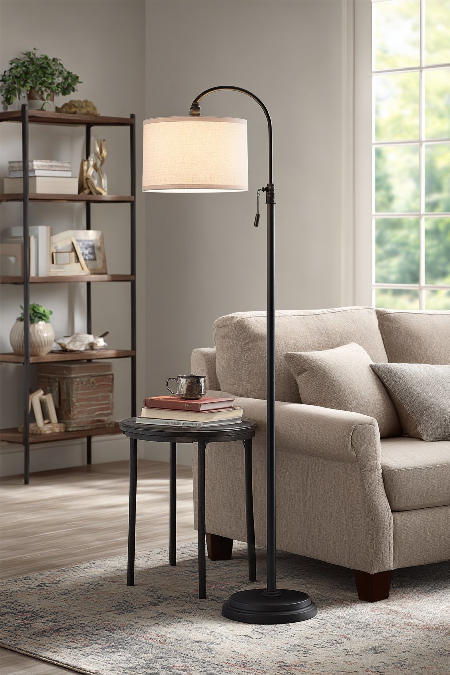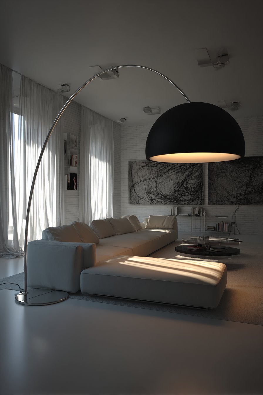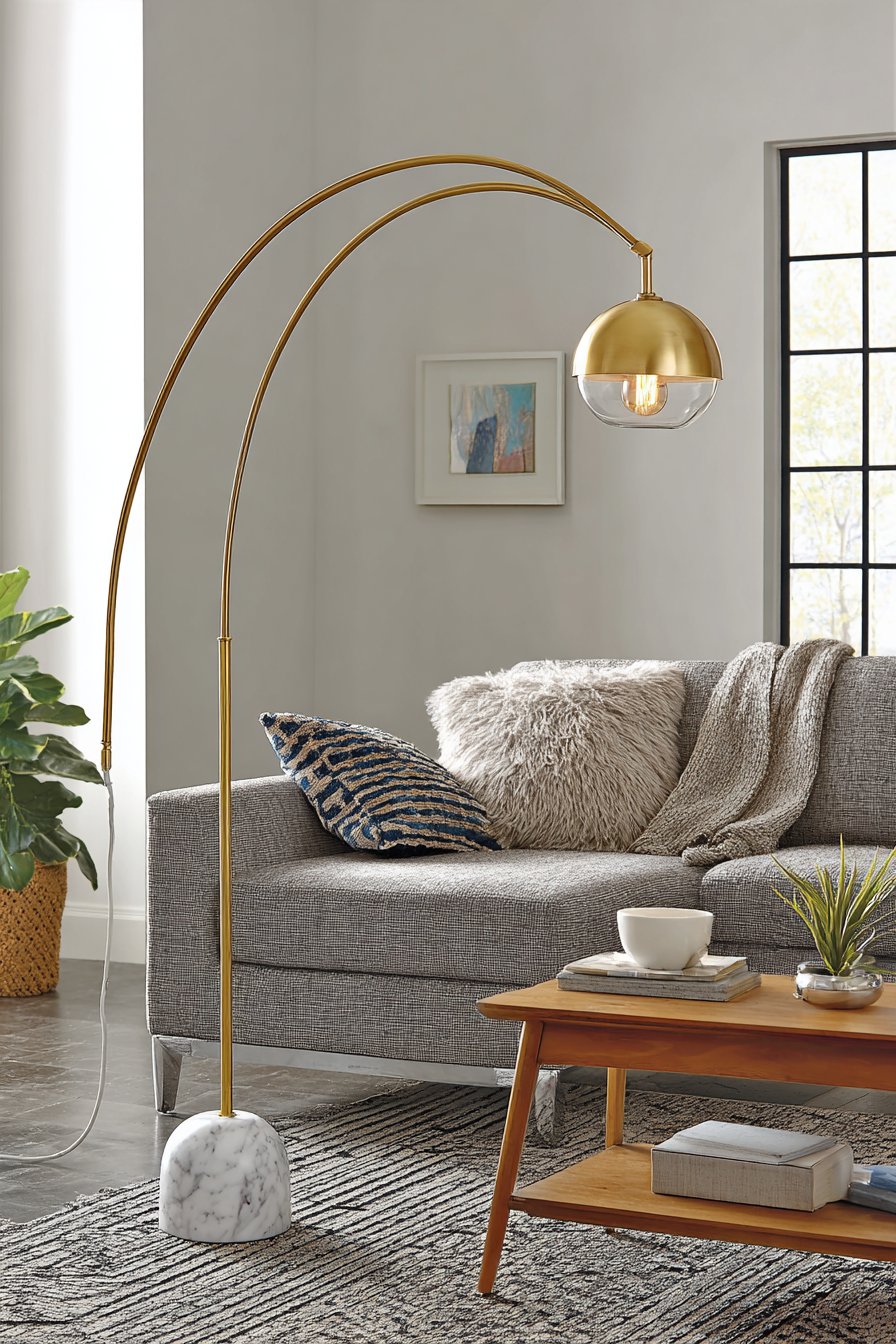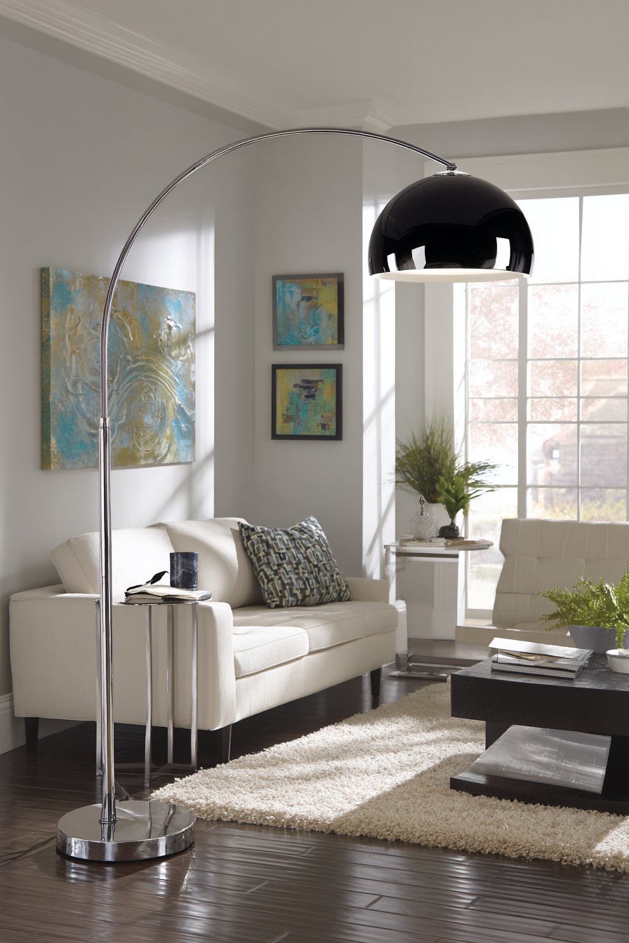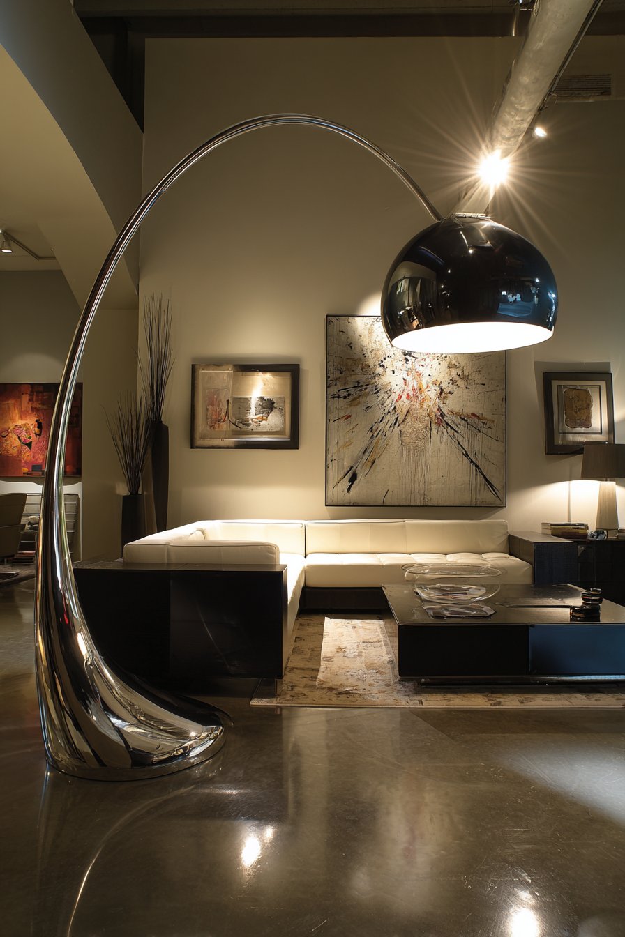 - Position arc lamps to extend over seating areas, eliminating the need for multiple table lamps and freeing up surface space
