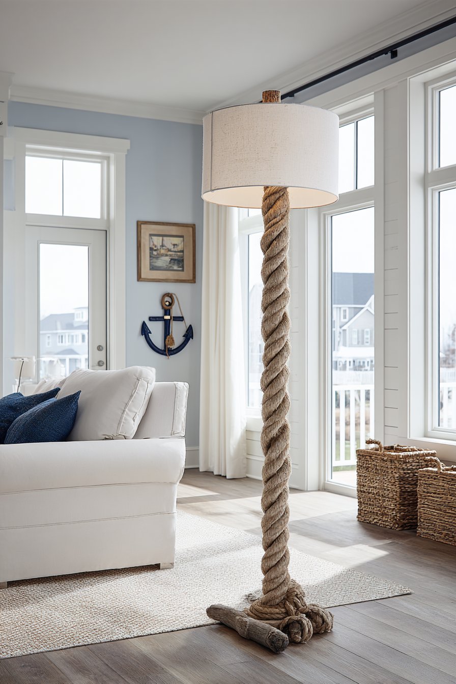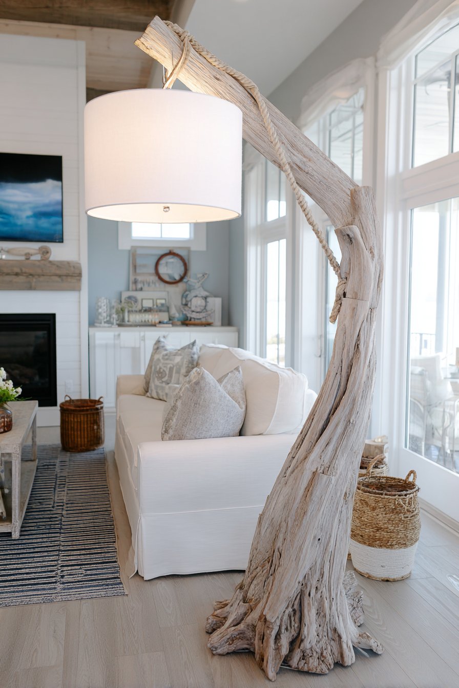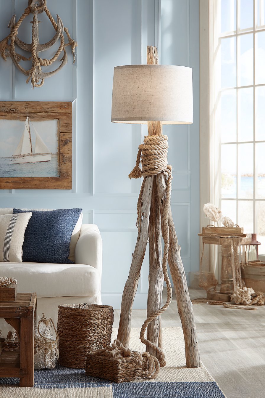 The weathered rope-wrapped floor lamp with white linen shade and driftwood accents brings breezy seaside atmosphere to coastal living rooms. This lamp complements a white slipcovered sofa, striped area rug in navy and cream, and seagrass baskets with effortless beach house charm. The rope wrapping adds maritime texture and demonstrates the coastal design principle of incorporating materials and motifs from the natural seaside environment. The driftwood accents—perhaps as decorative elements on the base or integrated into the stem—reference beachcombing and the organic sculptural forms created by ocean, wind, and time.