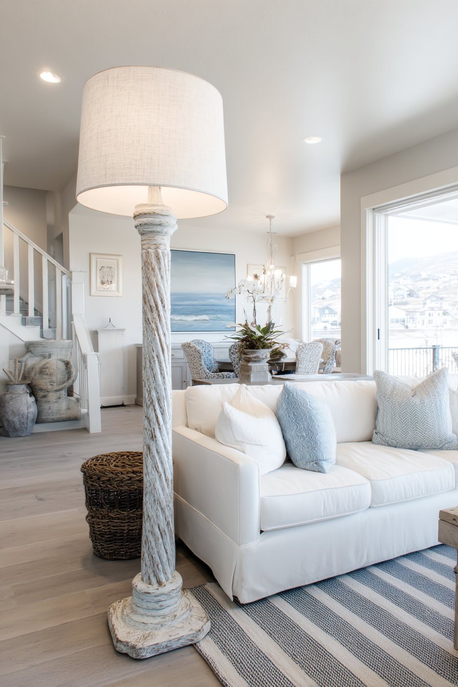 The coastal living room embraces a light, airy color palette dominated by whites, creams, and blues that reference sand, surf, and sky. A pale blue accent wall provides subtle color without overwhelming the bright, open feeling essential to successful coastal design. Nautical decor elements like rope, shells, and weathered wood reinforce the theme without resorting to cliché lighthouse or anchor motifs. Light-washed wood floors contribute to the sun-bleached aesthetic, while bright natural light mimics the intense illumination characteristic of seaside locations. Wide-angle interior photography with crisp, clean exposure showcases the lamp’s beach-inspired texture and breezy coastal aesthetic.