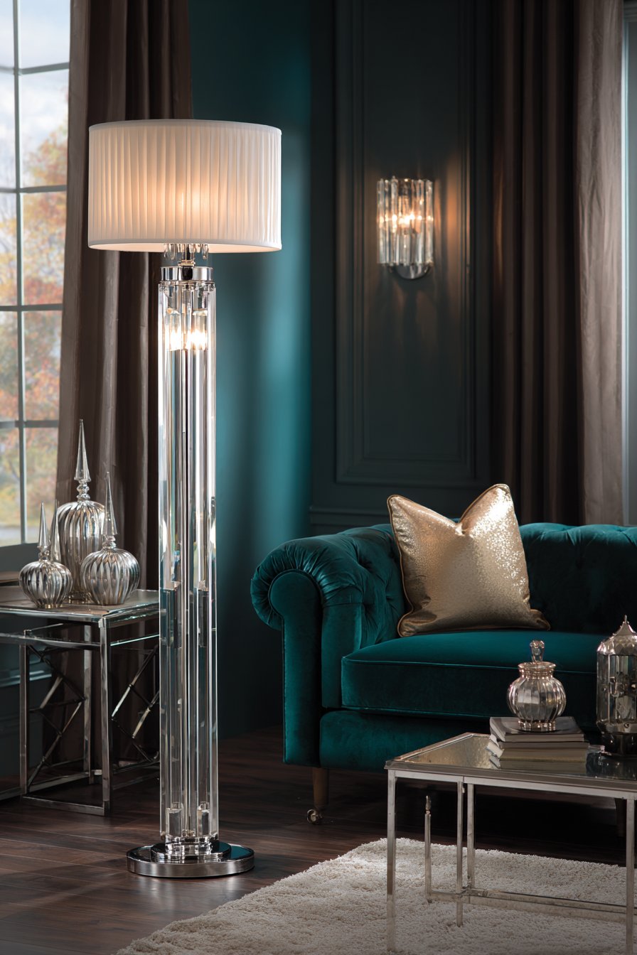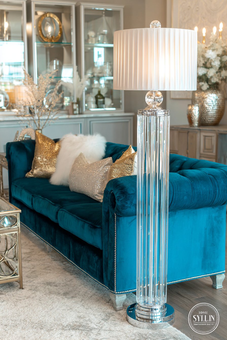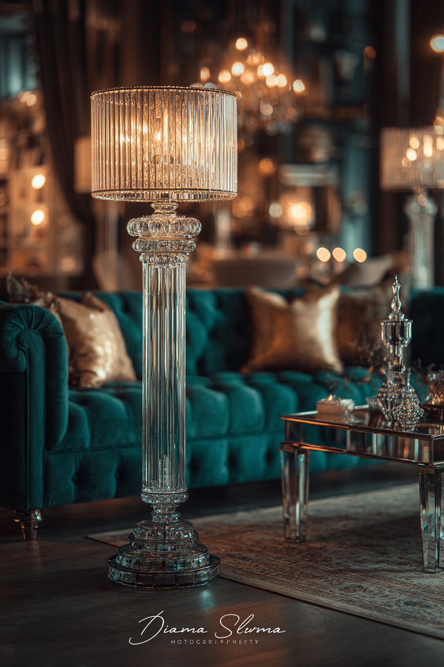 The tall crystal column floor lamp with chrome accents and ivory silk pleated shade represents maximum glamour and sophisticated luxury. Standing beside a velvet tufted sofa in deep emerald green with gold throw pillows, this lamp makes an unabashedly bold statement about elegance and refined taste. The crystal column catches and reflects light from every angle, creating sparkle and visual interest even when the lamp isn’t illuminated. Chrome accents add contemporary edge to what might otherwise feel overly traditional, while the ivory silk pleated shade contributes soft, diffused light quality.