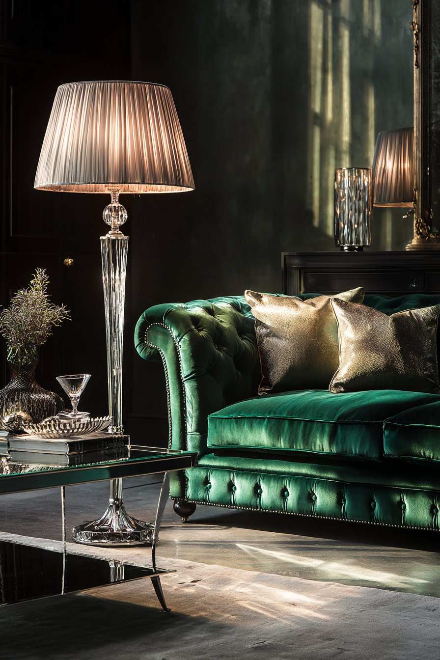 This glamorous living room pulls out all the stops with a mirrored coffee table, plush area rug, and metallic accent pieces that create a cohesive luxury aesthetic. The emerald green velvet sofa provides rich color and sumptuous texture that grounds the metallic elements, preventing the space from feeling cold despite all the reflective surfaces. Ambient lighting creates sparkle and reflection on the crystal elements, demonstrating how lighting design extends beyond the fixtures themselves to encompass how light interacts with all surfaces in the room. Professional interior photography with dramatic lighting captures the lamp’s luxurious materials and elegant statement presence.