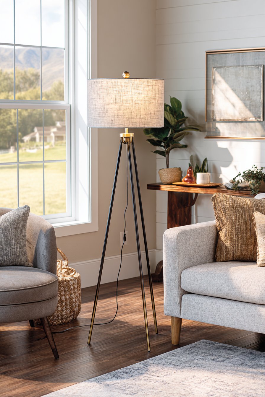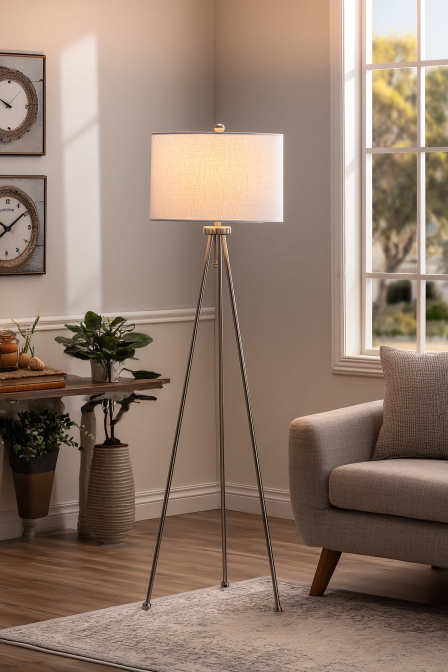 The versatile floor lamp with brushed nickel finish, clean-lined tripod base, and neutral grey linen shade represents the best of transitional design—combining traditional comfort with contemporary sensibility. This lamp sits between a comfortable upholstered sofa and accent chair in complementary tones, serving as a bridge piece that works with multiple styles. The brushed nickel finish offers subtle metallic interest without the boldness of polished chrome or the warmth of brass, making it remarkably adaptable to changing decor. The grey linen shade provides neutral elegance that complements virtually any color palette.