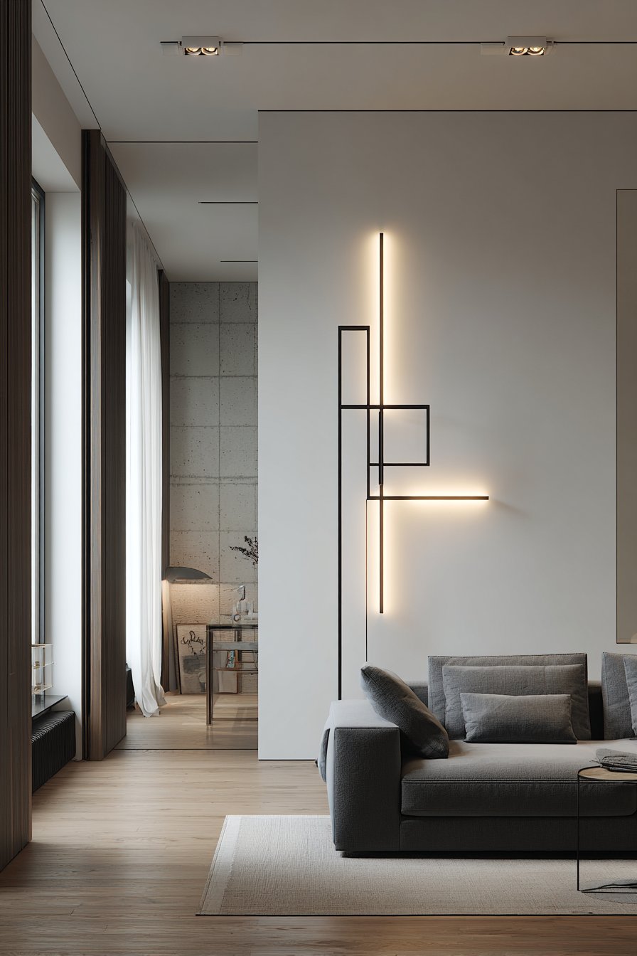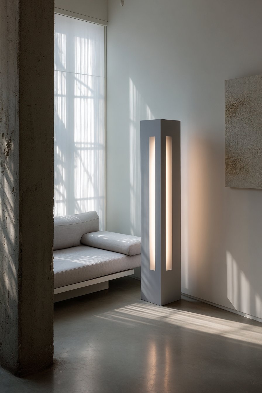 This minimalist living room includes polished concrete floors, a single statement art piece, and barely-there decor that creates serene, meditative atmosphere. Diffused natural light creates subtle shadows that change throughout the day, adding the only ornamentation this space requires. Professional interior photography with emphasis on negative space showcases the lamp’s architectural simplicity and clean geometric form. The abundant empty space isn’t absence but presence—intentional breathing room that allows each element to exist without competition.