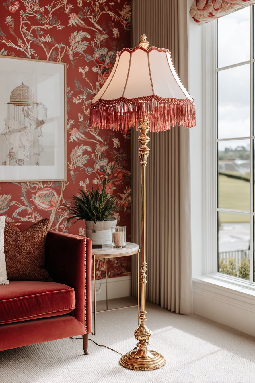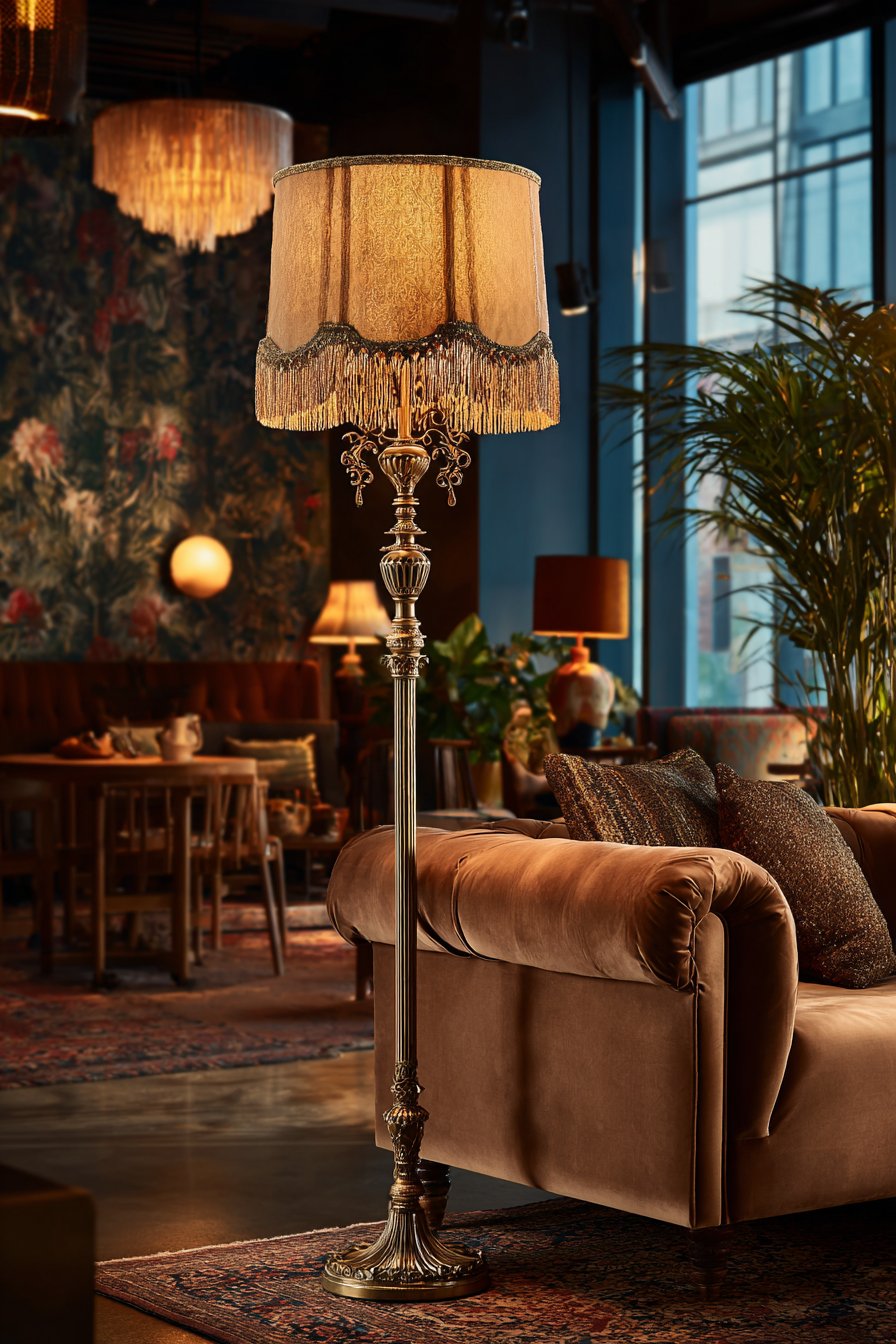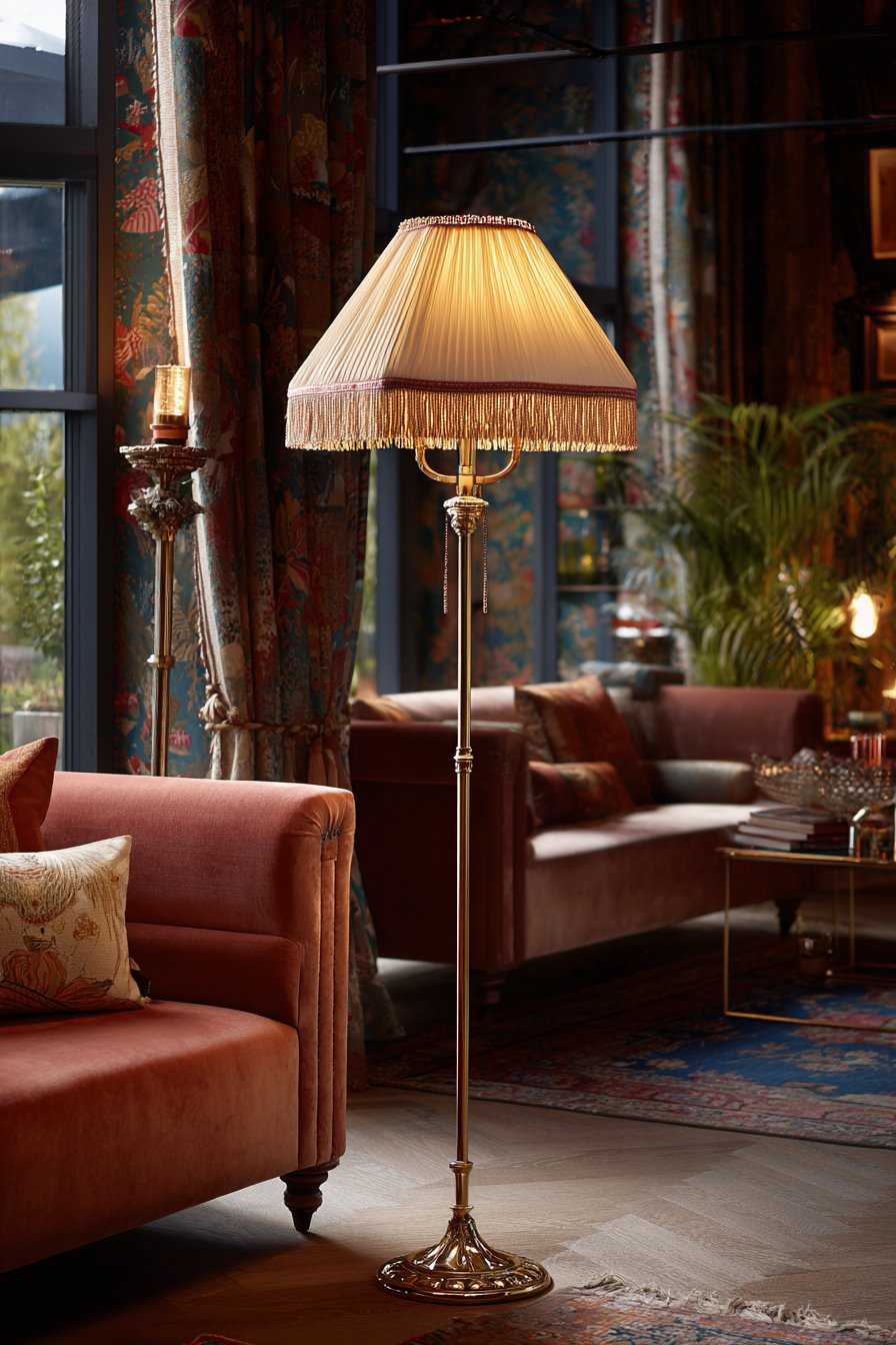 The vintage-inspired floor lamp with antique brass finish, ornate detailing, and parchment shade with fringe trim brings personality and history to eclectic living spaces. Standing among a curated mix of furniture styles—a modern velvet sofa, antique side table, and contemporary art—this lamp demonstrates how eclectic design celebrates diversity rather than demanding conformity. The antique brass finish suggests age and patina, while ornate detailing references historical periods when craftsmanship valued embellishment and decorative richness. The fringed parchment shade adds another layer of vintage character and filters light with warm, nostalgic quality.
