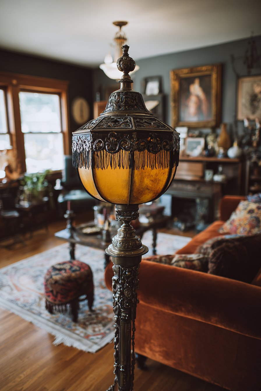 This lamp style particularly appeals to collectors and those who view their homes as personal galleries reflecting individual taste rather than adherence to design rules. The vintage character adds soul and warmth that new pieces cannot replicate, while the ornate details reward closer inspection. The fringed shade introduces subtle movement and shadow play, creating visual interest even when the lamp sits unlit. For those building eclectic interiors, statement lamps like this serve as conversation pieces that anchor vignettes and establish distinct zones within open-plan spaces.