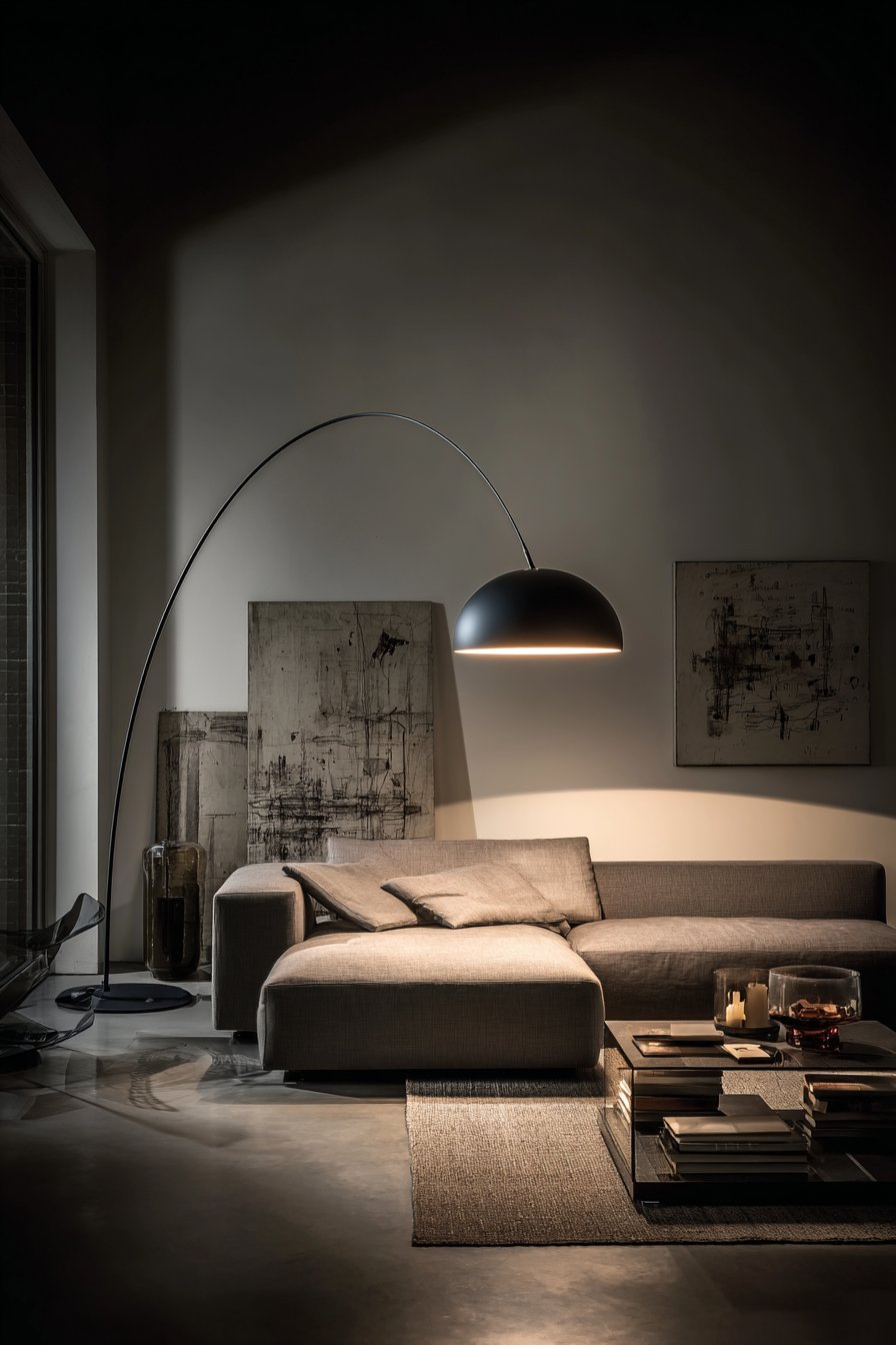 The sculptural arc floor lamp with polished stainless steel stem and dome-shaped aluminum shade in matte black makes a bold architectural statement in contemporary living rooms. The lamp dramatically curves over a sectional sofa, providing direct task lighting for reading while serving as functional sculpture that commands attention. The polished stainless steel creates striking contrast against the matte black shade, while the substantial arc demonstrates engineering precision and material confidence. This isn’t merely a lamp but a three-dimensional drawing in space that defines volume and creates dynamic visual tension.