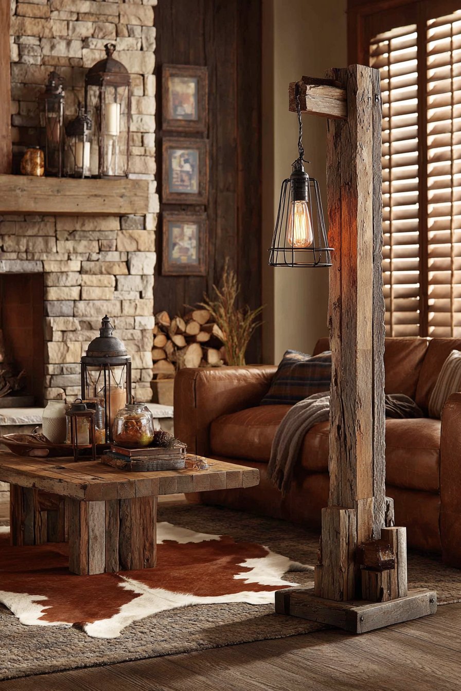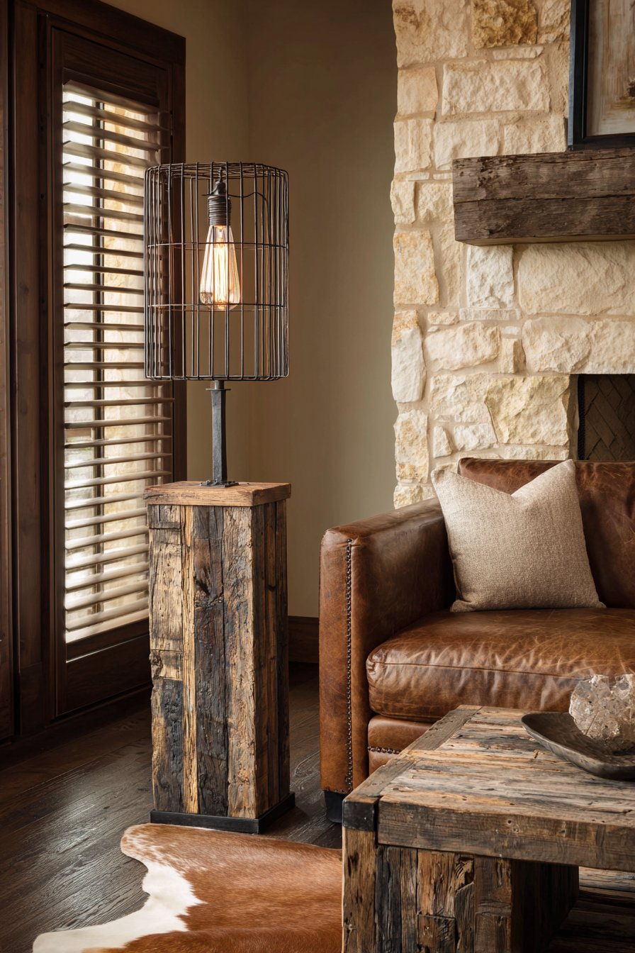 The floor lamp crafted from reclaimed barn wood with Edison-style exposed filament bulb and simple metal cage shade celebrates authentic rustic character and sustainable design. This lamp complements a leather sofa with visible grain and texture alongside a live-edge wood coffee table, creating cohesive organic aesthetic. The reclaimed wood base tells stories through nail holes, saw marks, and weathered patina that new lumber cannot replicate. Each piece possesses unique character based on its previous life, whether as barn siding, fencing, or structural beams.