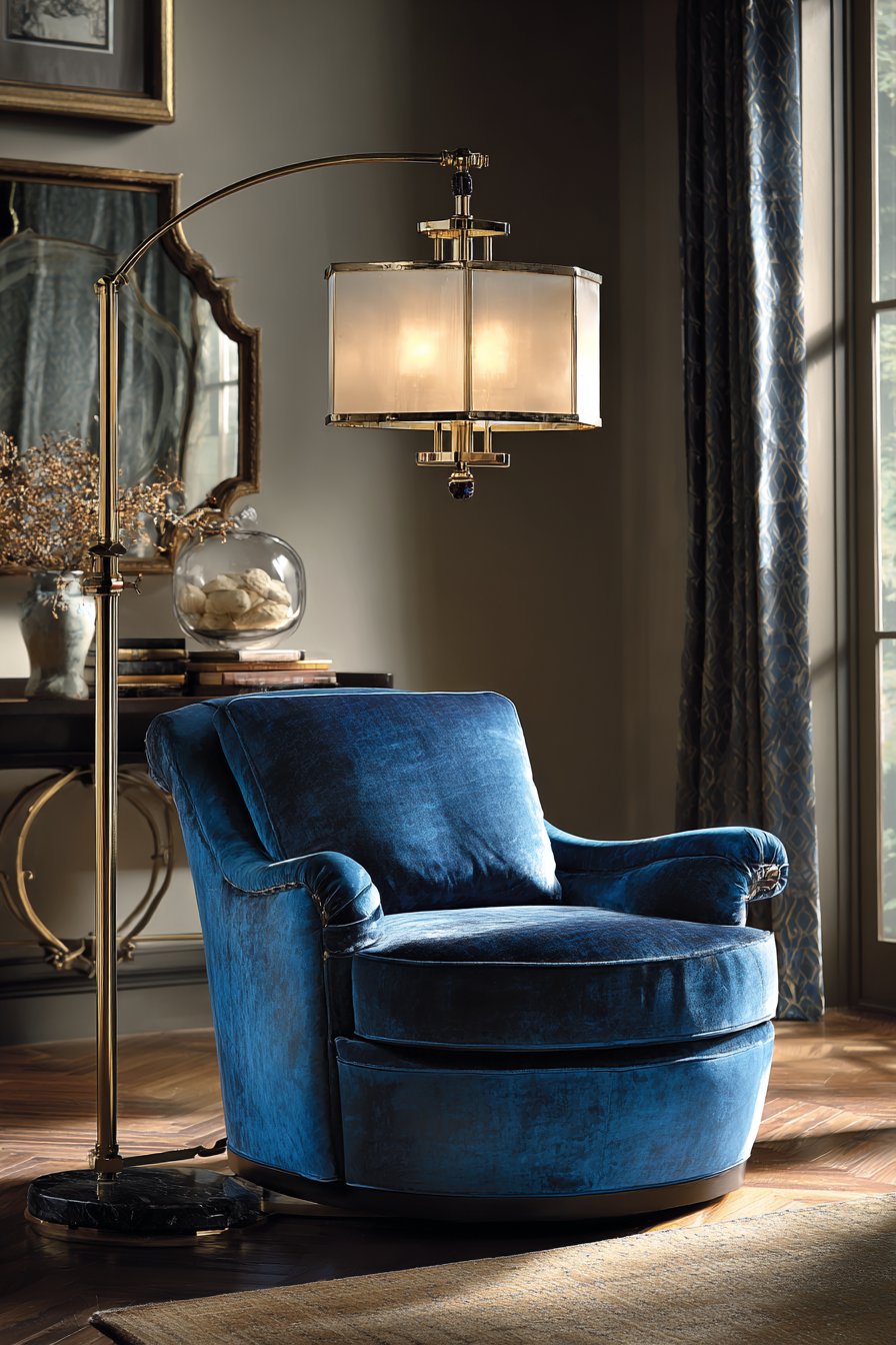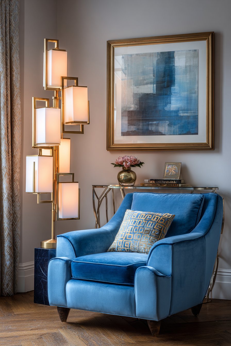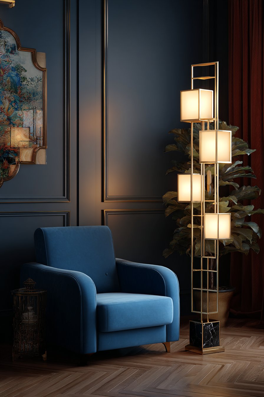 The geometric stepped floor lamp in polished brass with frosted glass panels and black marble base captures the bold glamour of art deco design. Standing beside a jewel-tone velvet armchair in sapphire blue with curved arms, this lamp references the design revolution of the 1920s and 30s when geometric forms, luxurious materials, and bold contrasts defined modern sophistication. The stepped profile creates architectural interest through pure geometry, while the polished brass gleams with unapologetic luxury. Frosted glass panels diffuse light while contributing to the geometric composition, and the black marble base provides visual weight and material opulence.