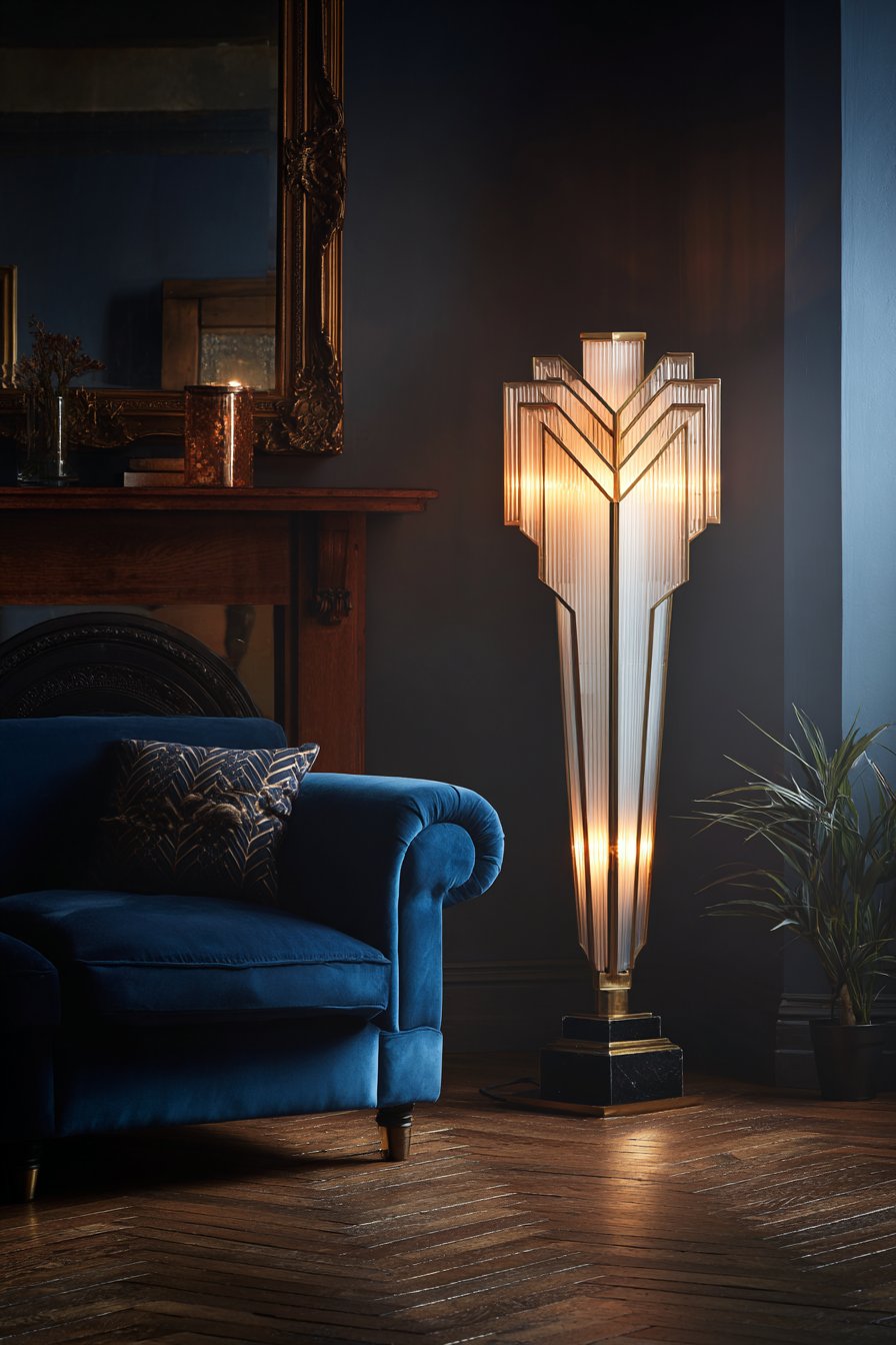 This art deco living room includes chevron wood flooring, mirrored accents, and bold geometric patterns that reinforce the period aesthetic. Dramatic lighting emphasizes the lamp’s angular design and metallic finishes, creating the theatrical atmosphere characteristic of art deco interiors. Professional interior photography with period-appropriate styling captures the lamp’s glamorous 1920s-inspired aesthetic and luxurious materials. The jewel-tone velvet and metallic accents create richness and sophistication while the geometric patterns add visual energy and dynamic movement.