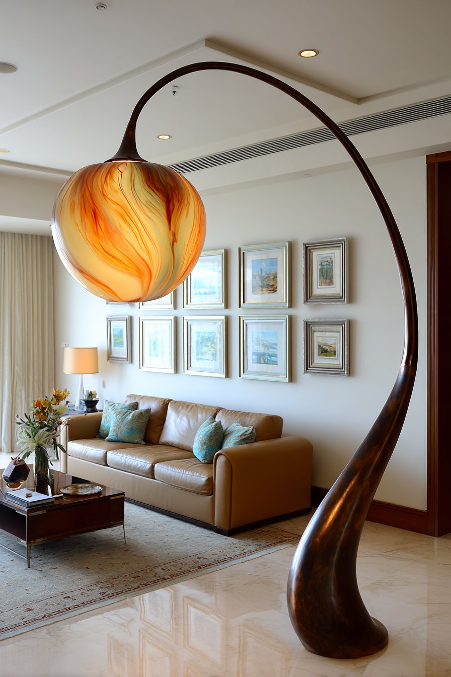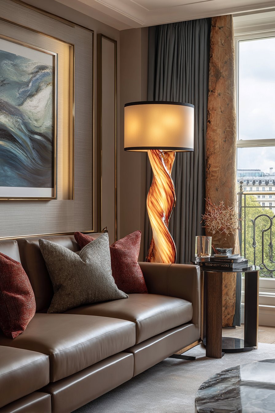 The designer floor lamp with hand-blown Murano glass shade in swirled amber and cream supported by sculptural bronze base represents lighting as fine art and investment piece. This lamp serves as functional sculpture beside a high-end Italian leather sofa with custom cushions, demonstrating how exceptional design transforms everyday objects into extraordinary experiences. The hand-blown Murano glass showcases centuries-old Venetian glassmaking traditions, with each piece unique due to the artisan’s hand and the glass’s fluid nature during creation. The swirled amber and cream create luminous beauty both lit and unlit, while the sculptural bronze base provides worthy pedestal for this remarkable shade.