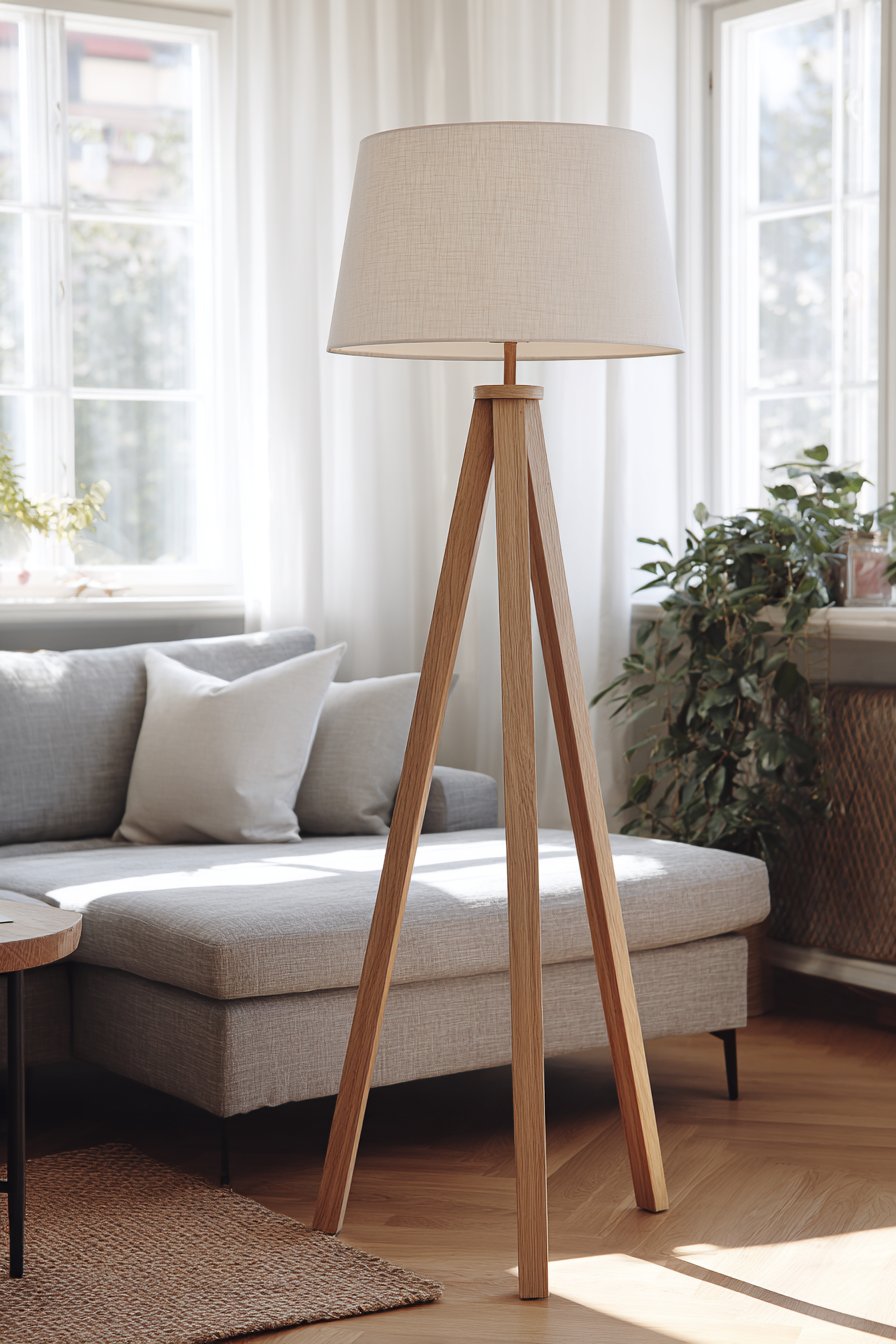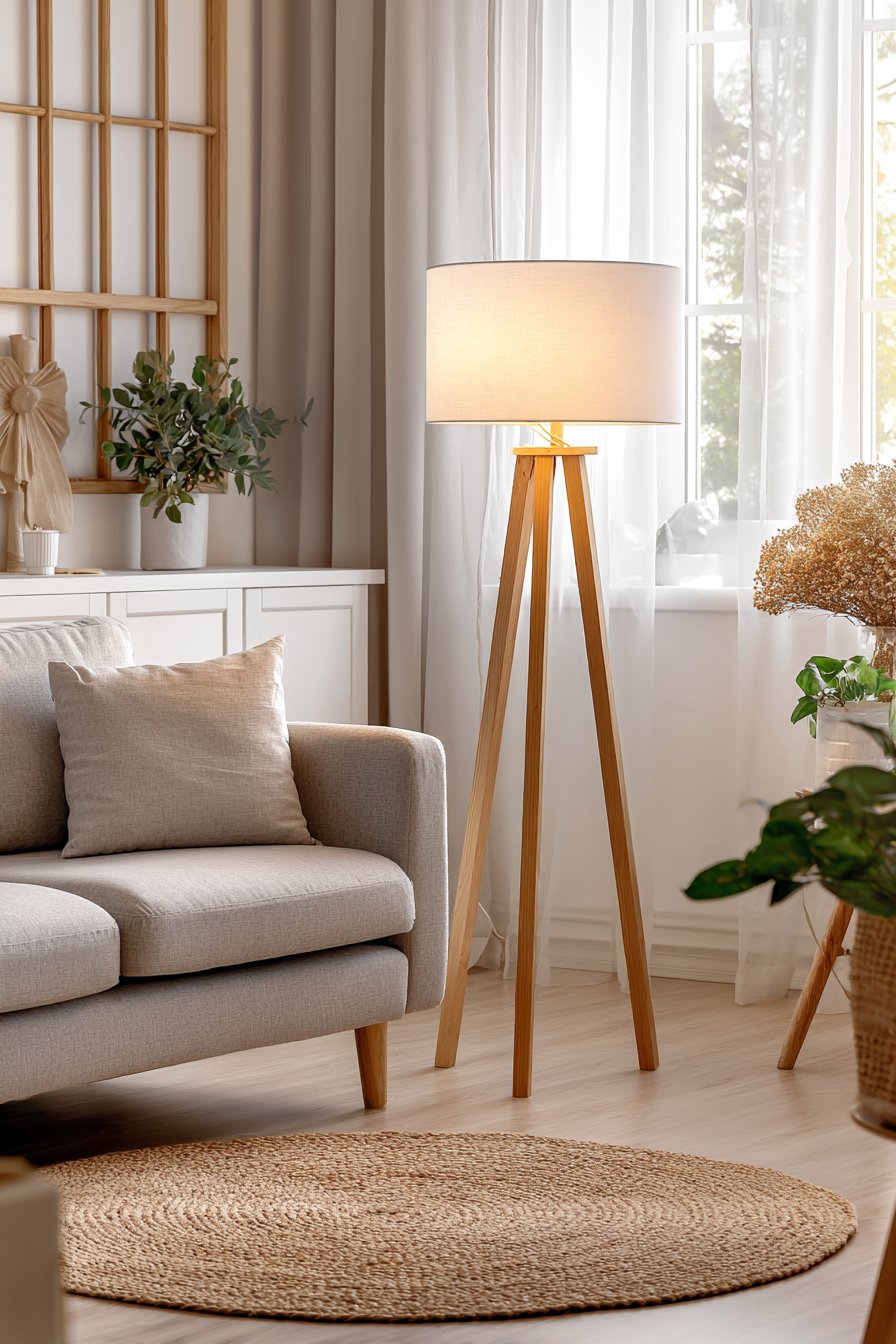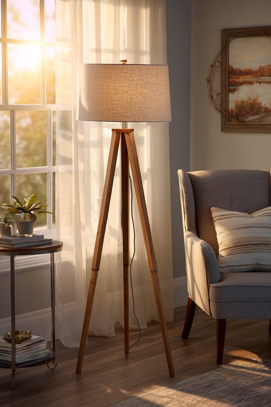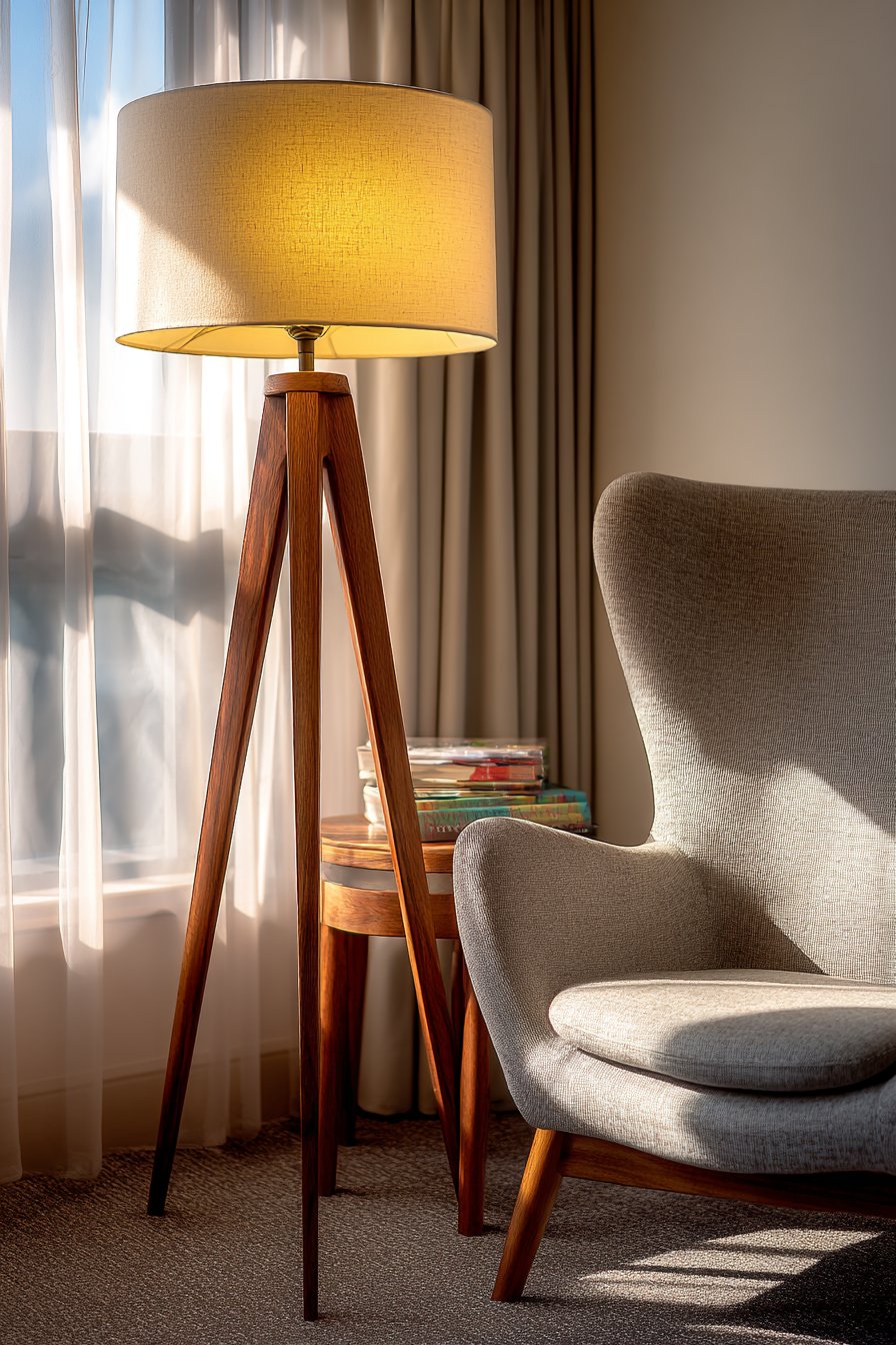 - Select furniture with exposed wooden legs to create visual continuity with tripod lamp bases