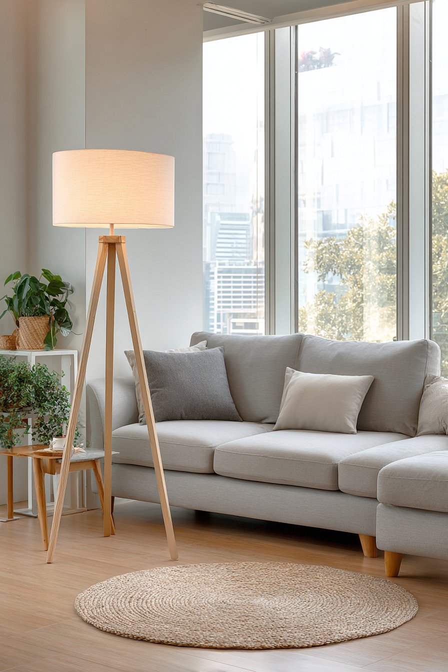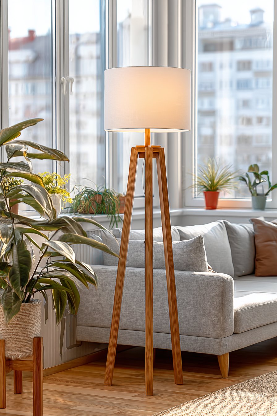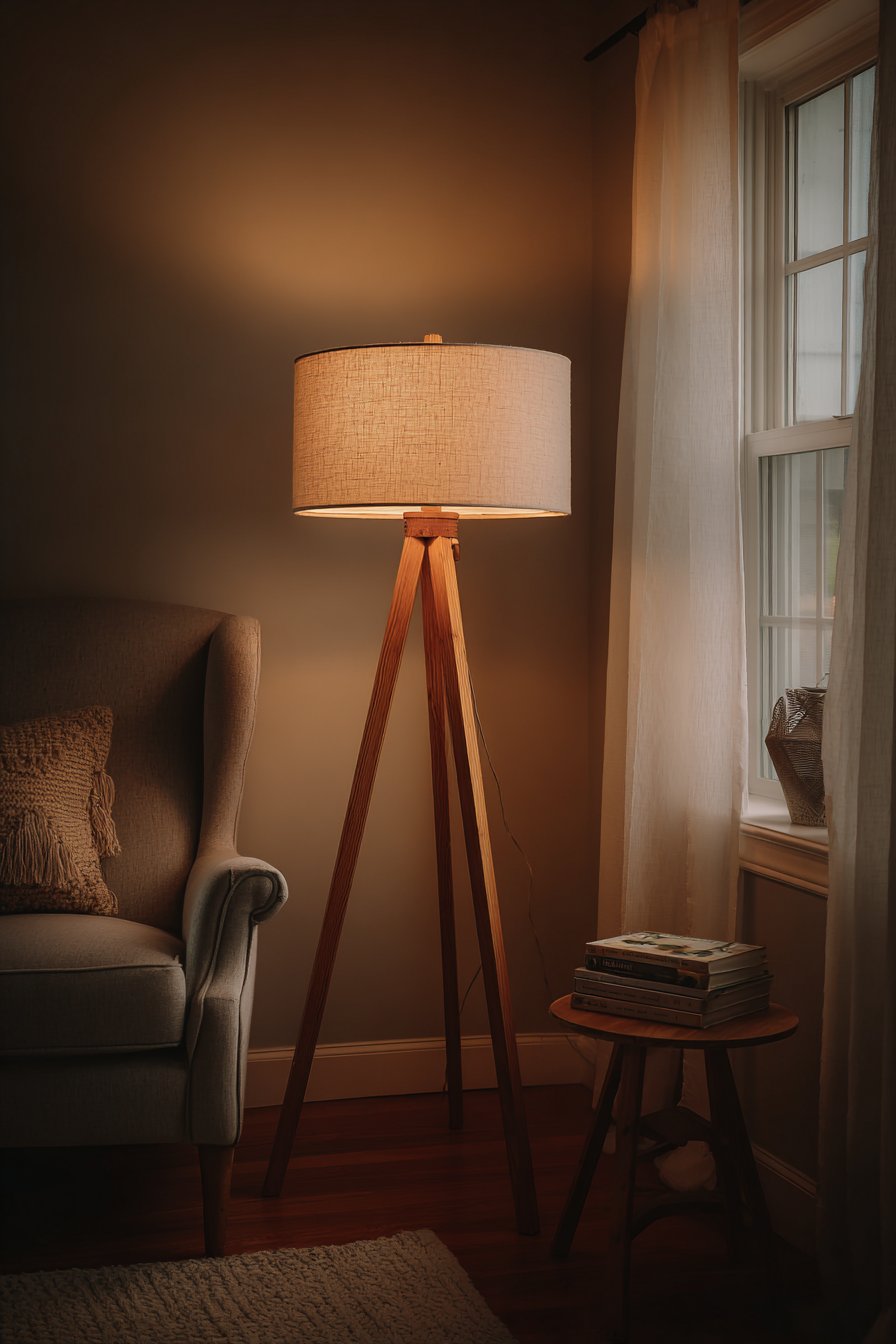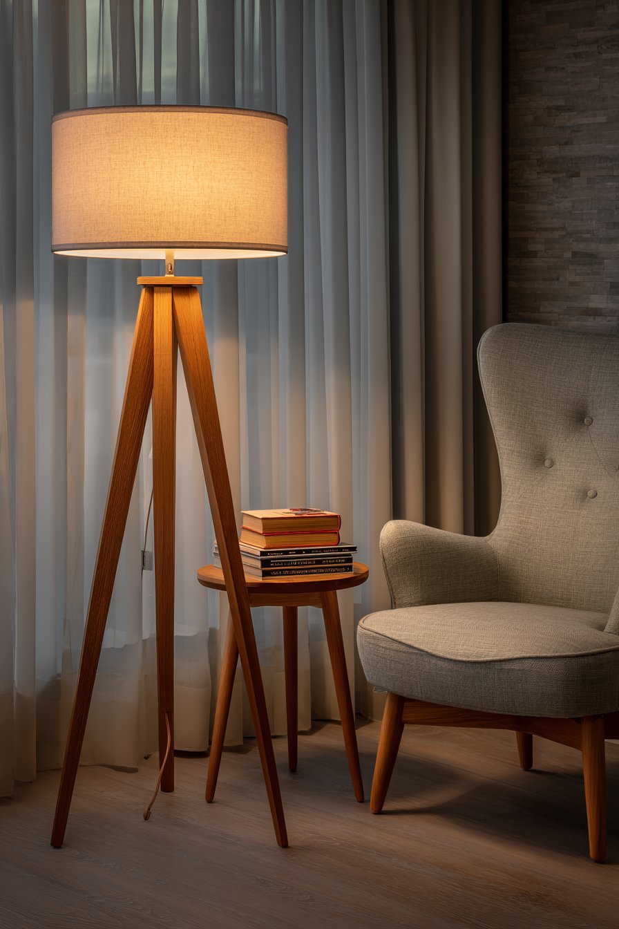 - Select furniture with exposed wooden legs to create visual continuity with tripod lamp bases
