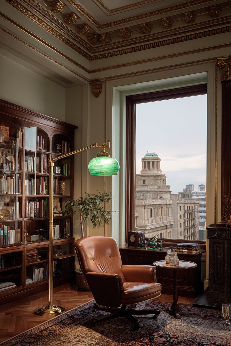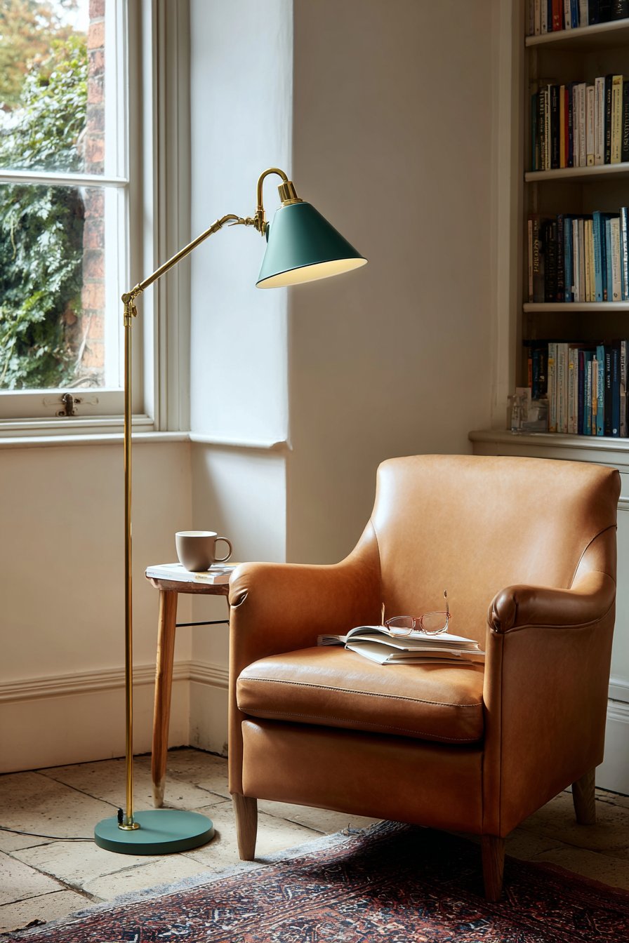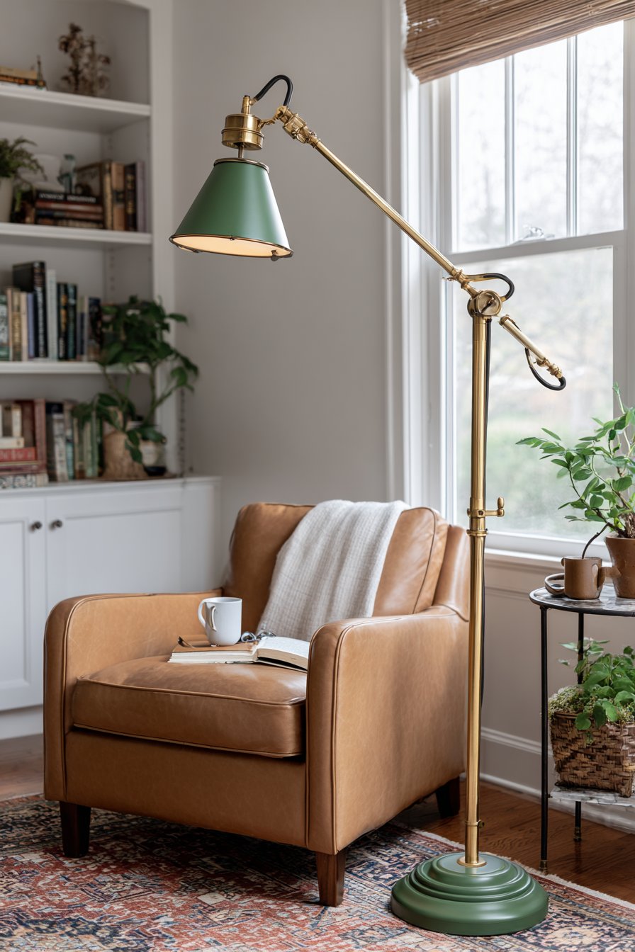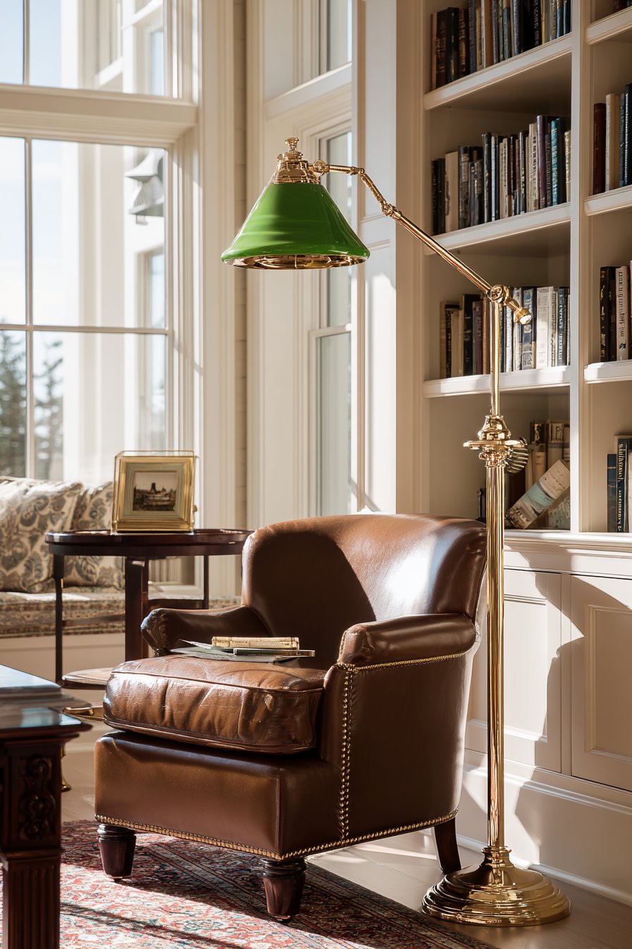 The traditional pharmacy-style floor lamp with pivoting brass arm and green banker’s shade positioned beside a comfortable armchair upholstered in camel leather creates the perfect dedicated reading sanctuary. This lamp provides precisely the focused, adjustable task lighting essential for extended reading sessions without eye strain. The pivoting brass arm allows exact positioning over reading materials, while the green banker’s shade has become iconic through its association with libraries, studies, and scholarly pursuits. The warm glow through the green glass creates nostalgic atmosphere that enhances the reading experience beyond mere illumination.