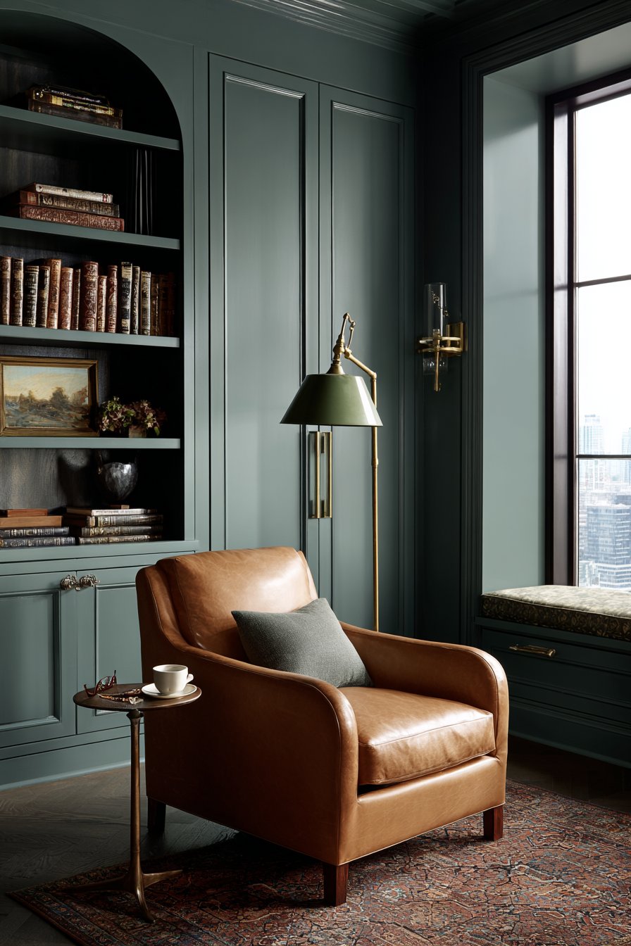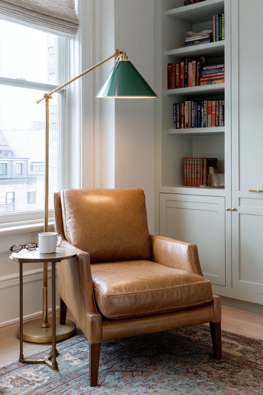 The dedicated corner includes built-in bookshelf, small side table with reading glasses and coffee mug, and Persian-style rug that defines this zone as distinct retreat within the larger living room. Soft natural light from a nearby window supplements the lamp’s focused task lighting during daytime hours, while evening reading relies entirely on the lamp’s warm, directed glow. Detail-oriented interior photography captures the cozy, functional reading space and the lamp’s adjustable, practical design. The camel leather chair develops beautiful patina over time, the books show their well-loved condition through cracked spines and turned-down pages, and the entire vignette celebrates the quiet pleasure of reading.