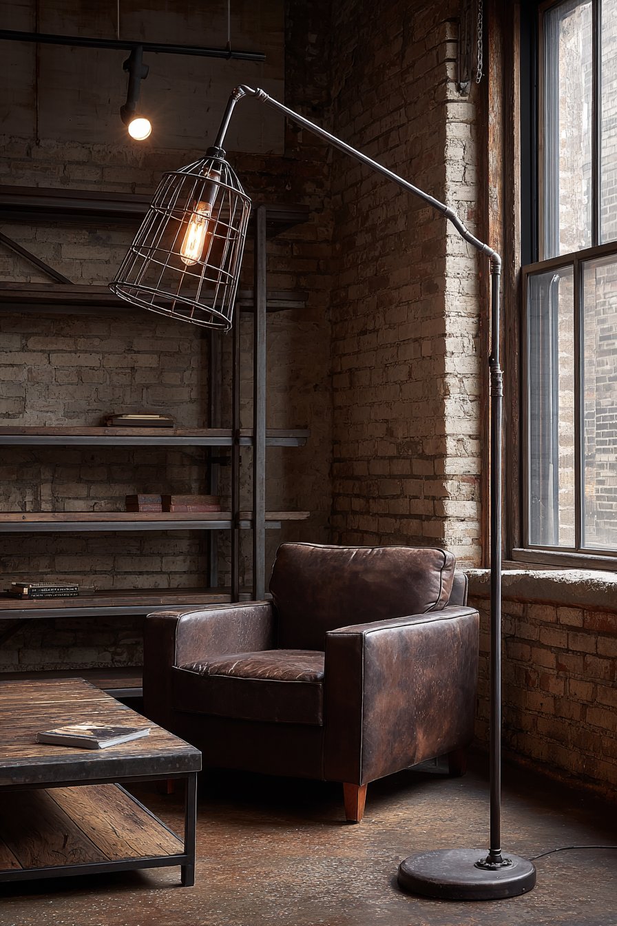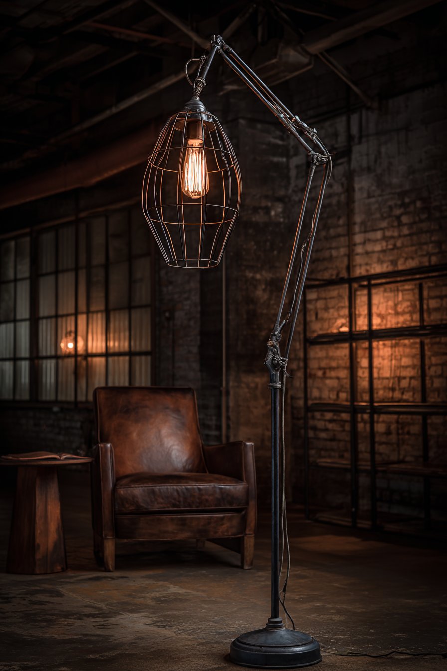 The vintage-style Edison bulb floor lamp with exposed black metal cage and adjustable arm brings raw, utilitarian charm to industrial living spaces. Standing beside a distressed leather armchair against exposed brick walls, this lamp celebrates honest materials and visible construction methods. The exposed bulb showcases the warm amber filament, turning the light source itself into a decorative element rather than hiding it behind shades or diffusers. The black metal cage provides both protection and industrial aesthetic, while the adjustable arm offers functional flexibility uncommon in more decorative lamp styles.