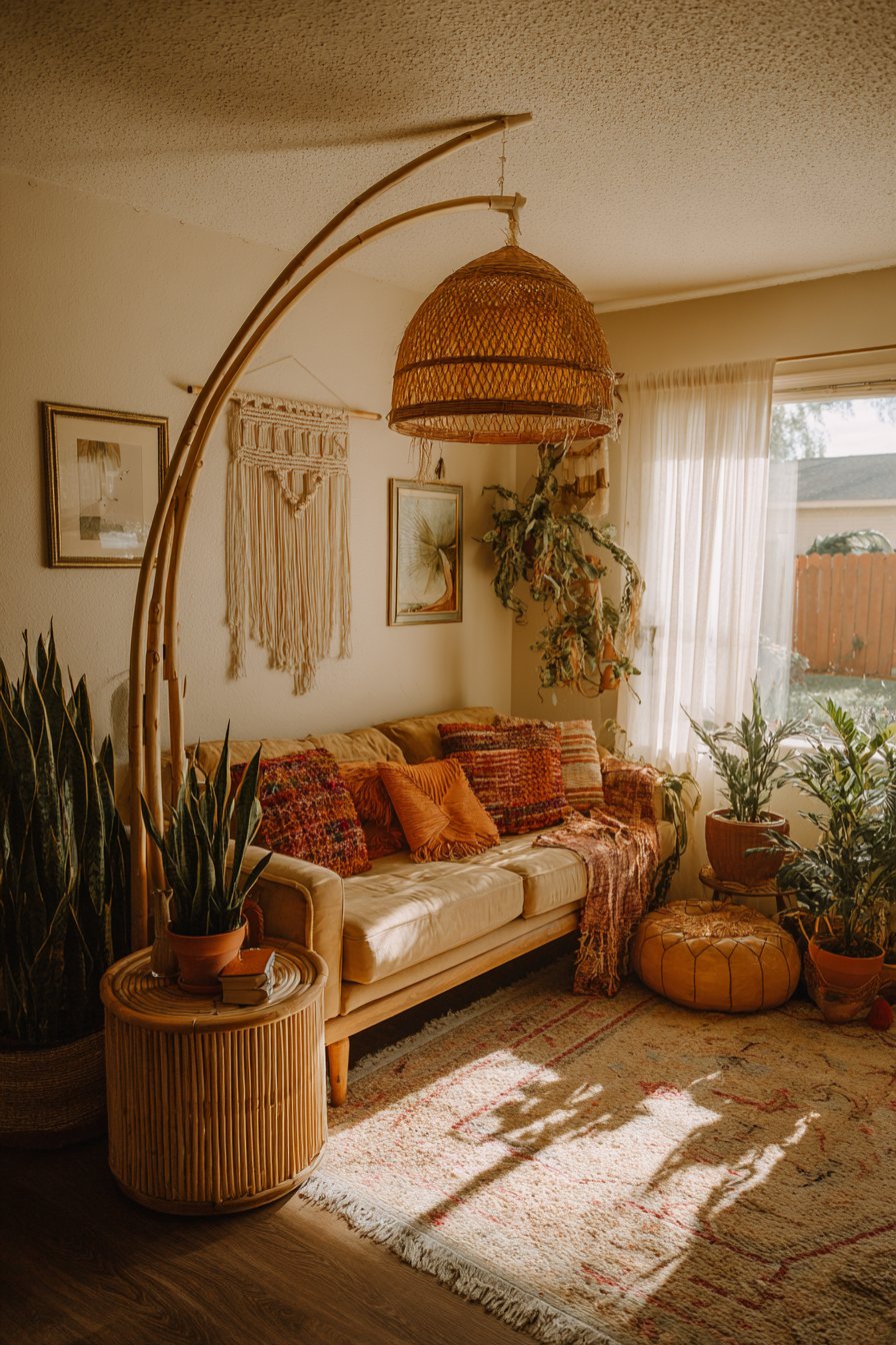 Bohemian design thrives on layering and eclecticism, and this living room exemplifies these principles beautifully. Multiple vintage rugs overlap to define the seating area while adding color and pattern underfoot. Macramé wall hangings introduce vertical texture and handmade character, while an abundance of potted plants brings life and organic movement to every corner. Warm afternoon sunlight filters through sheer curtains, mixing with the lamp’s amber glow to create the golden, welcoming atmosphere characteristic of successful boho spaces. Interior design photography captures this eclectic mix of textures and the lamp’s organic, handcrafted quality.